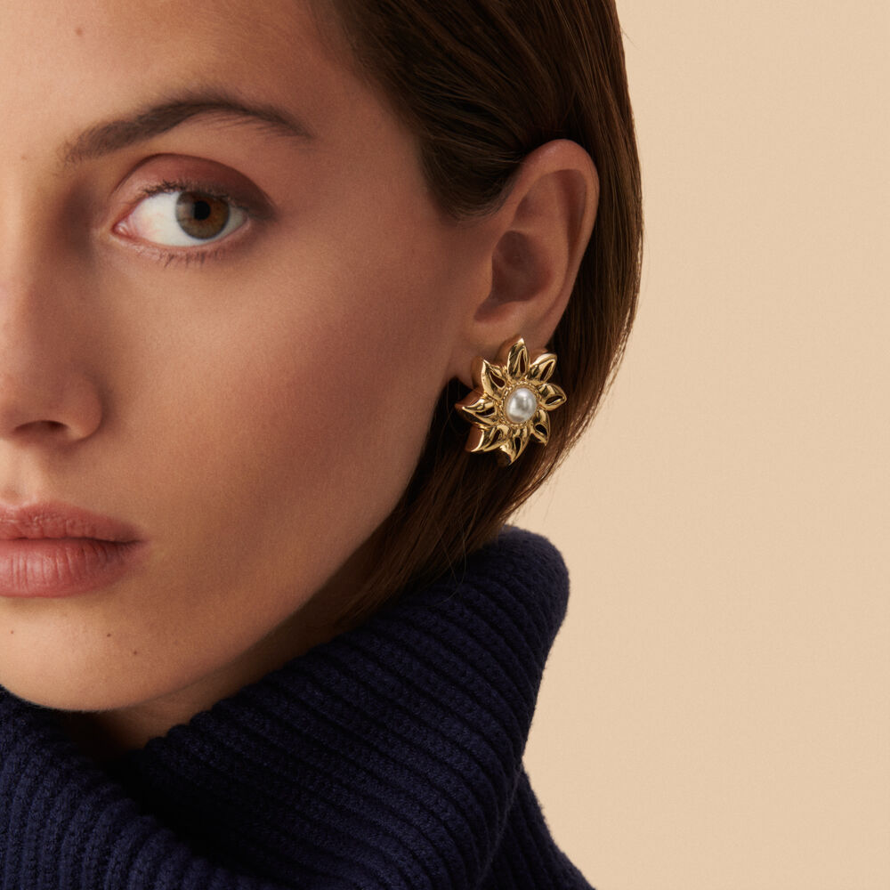 Pendientes de clip con forma de sol, acabados en oro y perla en el centro. Aportan un toque de sofisticación a tus looks preferidos. La colección nº13 de María Pombo revive el encanto de las joyas vintage de Agatha Paris.