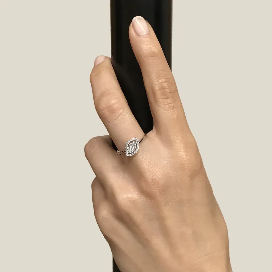 Anillo de la colección Leaves and Crossed de Jaibor, diseñado en oro blanco de 18 quilates (2,26 g aprox.) con un total de 31 diamantes de color GH y pureza SI, que suman 0.26 ct. Diseño cruzado con inspiración natural y sofisticación contemporánea.