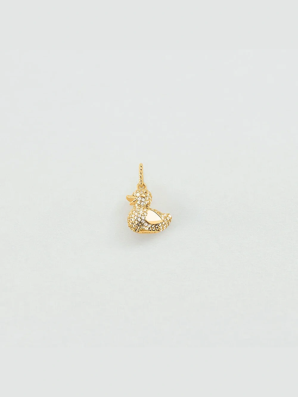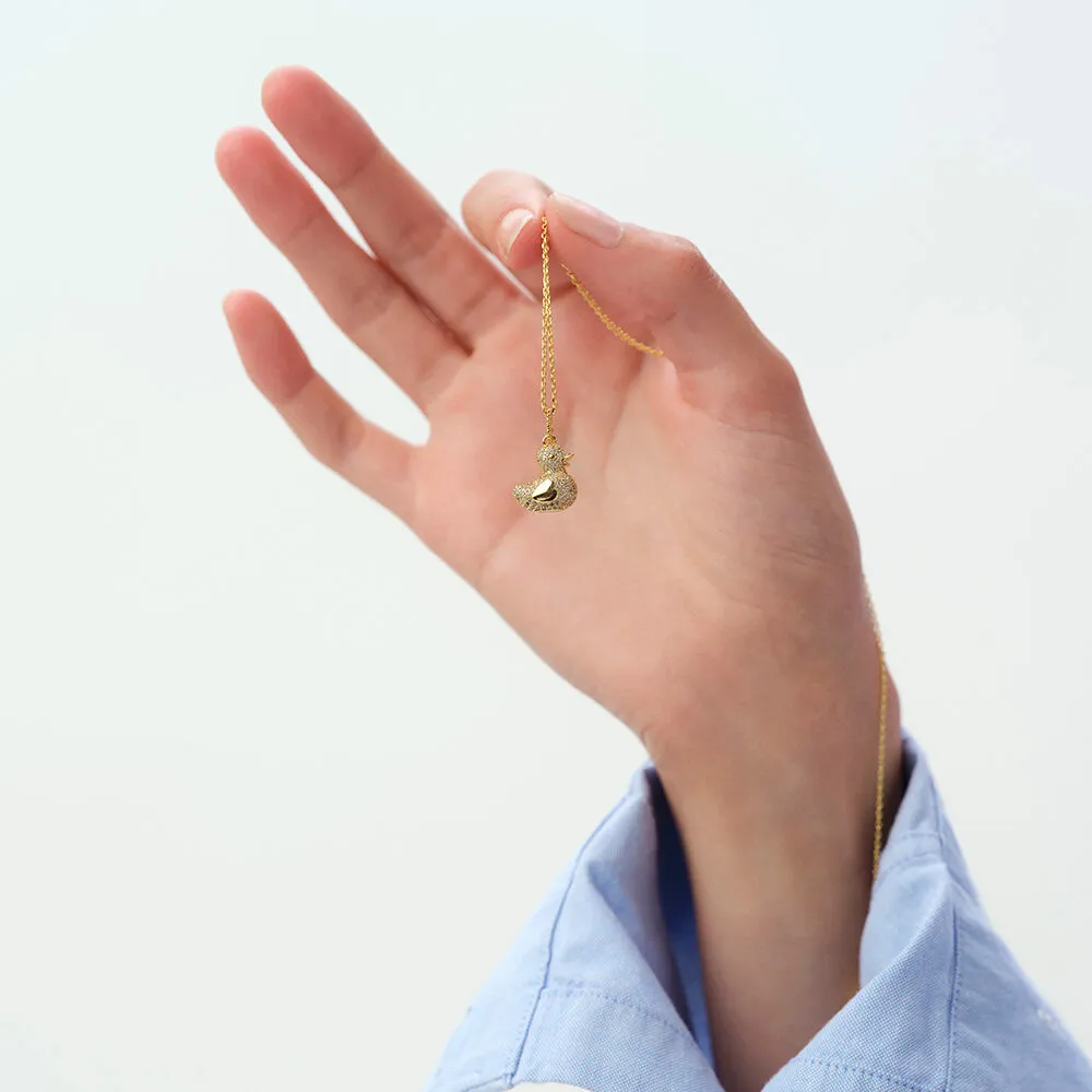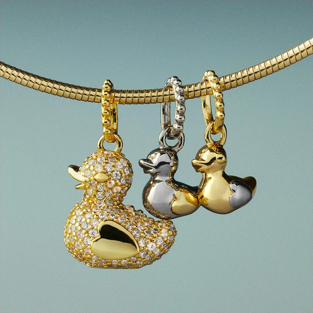 Amuleto “Mamá Pata” con circonitas engastadas en pavé y acabado dorado. Motivo de pato, tamaño aproximado 13×13 mm, ideal para personalizar cadenas de la colección Lucky y crear un collar con significado familiar.