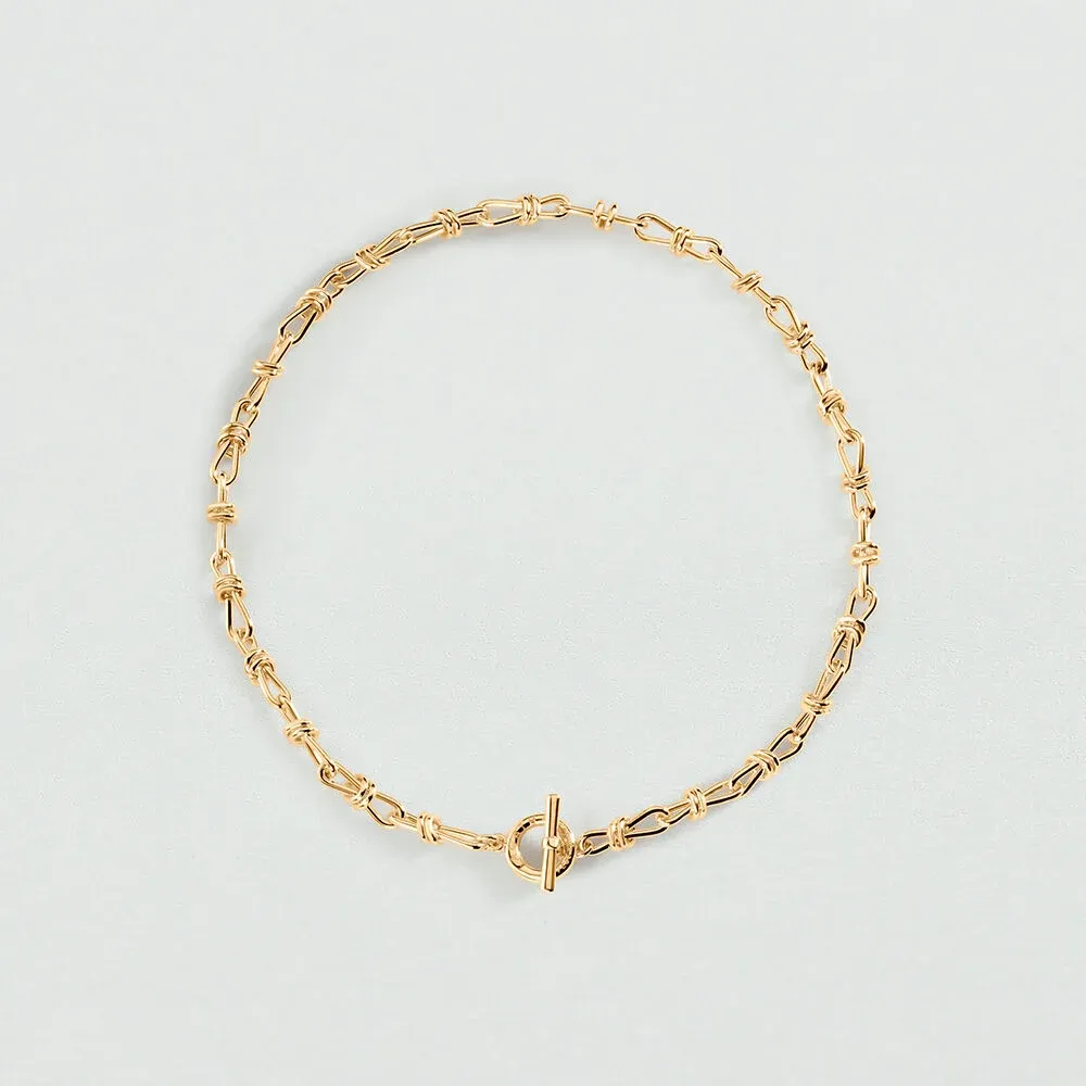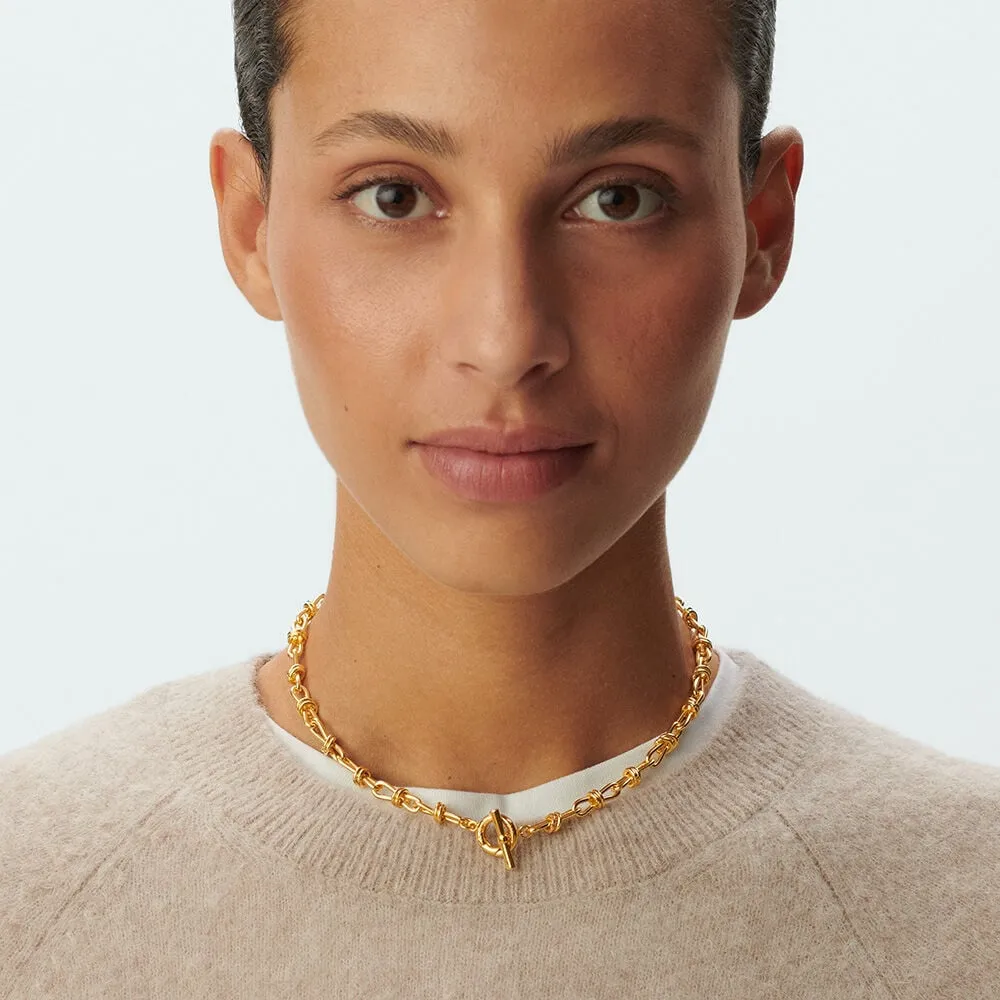 Collar corto de cadena malla con nudos y baño de oro, con llamativo cierre bâton en el frontal que lo convierte en protagonista del escote desde el primer vistazo. Base imprescindible dentro del sistema Talismans de AGATHA para construir joyas de cuello totalmente personalizadas. Añade los colgantes que mejor reflejen tu estilo o el momento, combínalos entre sí y crea cada día una versión diferente y única. Un collar con carácter propio que eleva cualquier look y despierta la curiosidad de quien lo ve.