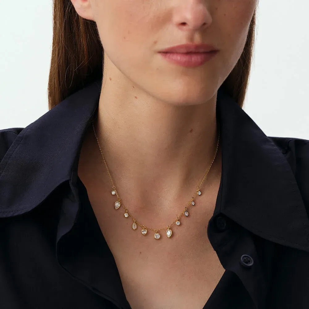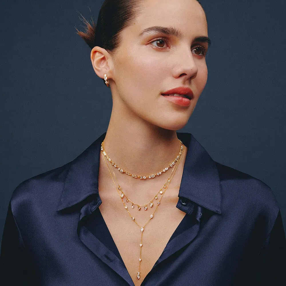Este collar corto Candy de Agatha Paris apuesta por un diseño más llamativo gracias a sus múltiples pampillas de formas diferentes, todas acabadas en oro. La cadena, de largo regulable, se cubre de pequeños motivos que generan un efecto de cascada de luz alrededor del cuello. Es una pieza ideal para quienes disfrutan de collares con movimiento y presencia, sin renunciar al estilo femenino y delicado de la colección.