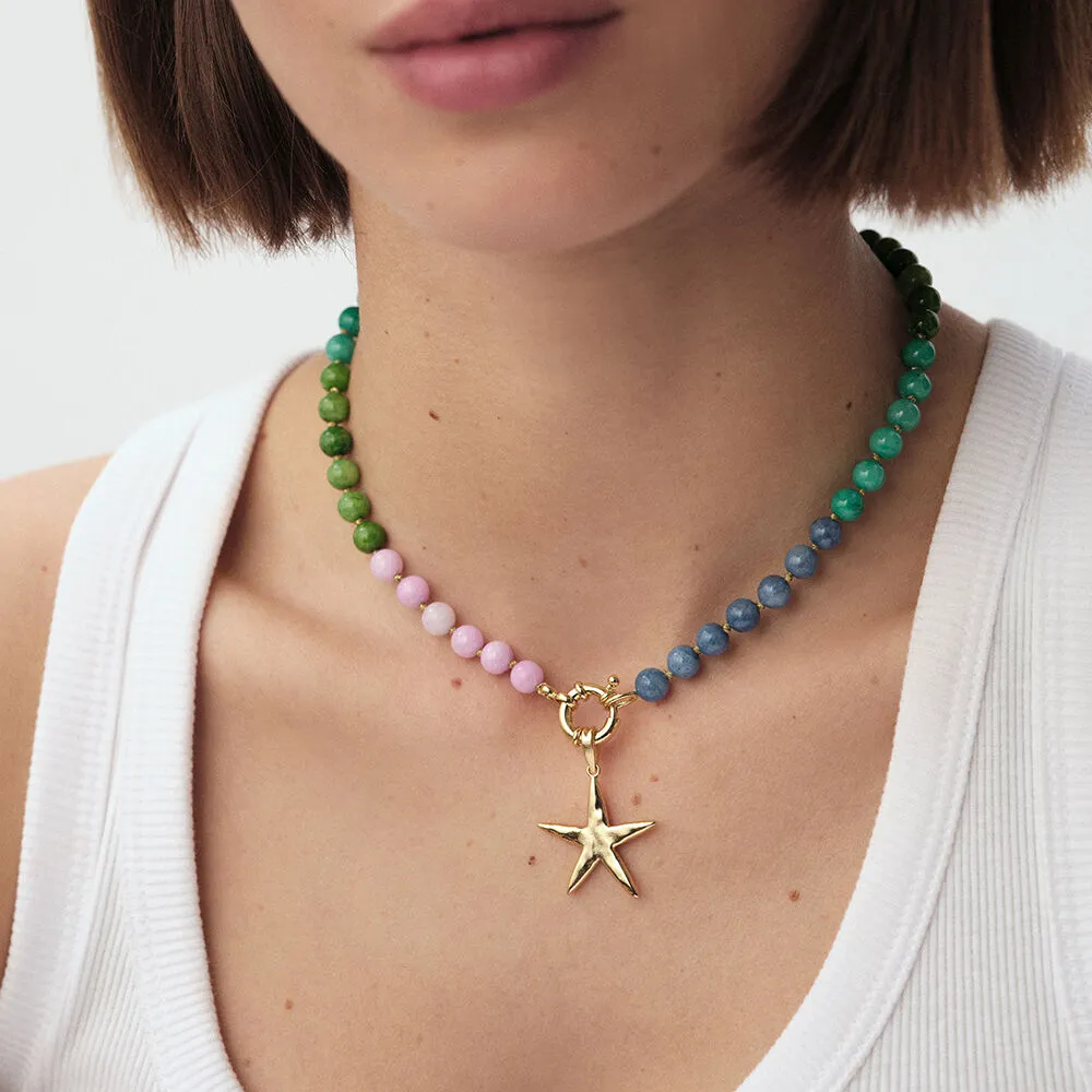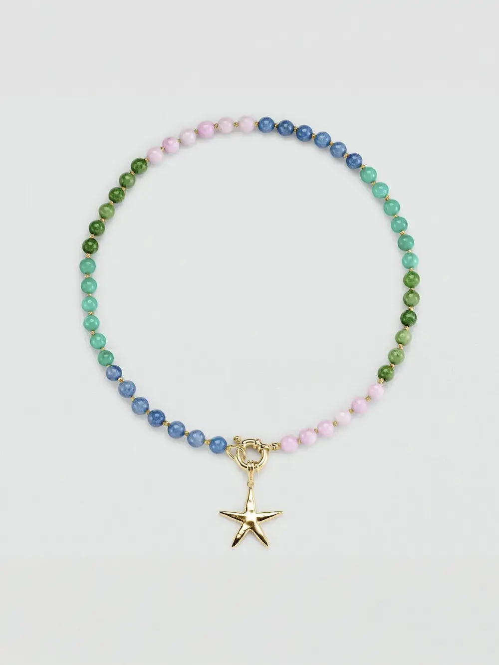 Collar corto dorado con perlas de jade tintado en tonos azul, turquesa, verde y malva. Lleva un colgante en forma de estrella que aporta color y vitalidad a cualquier look veraniego.