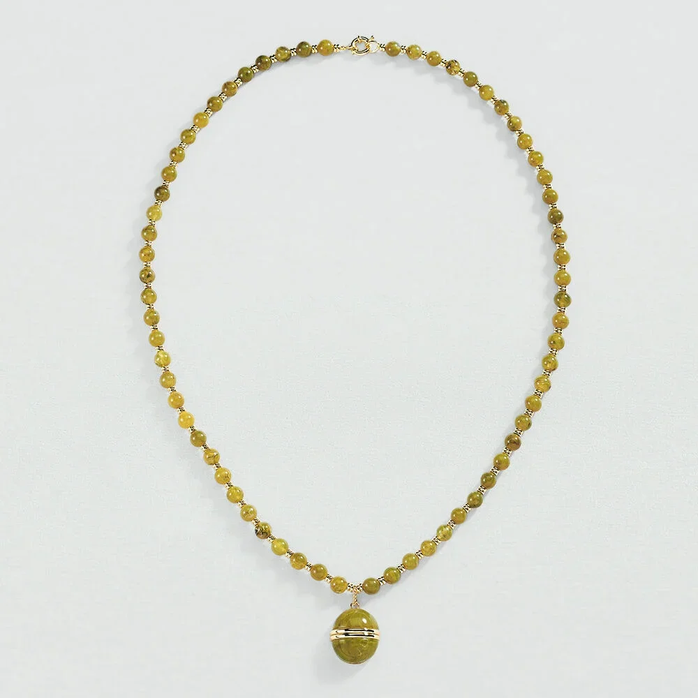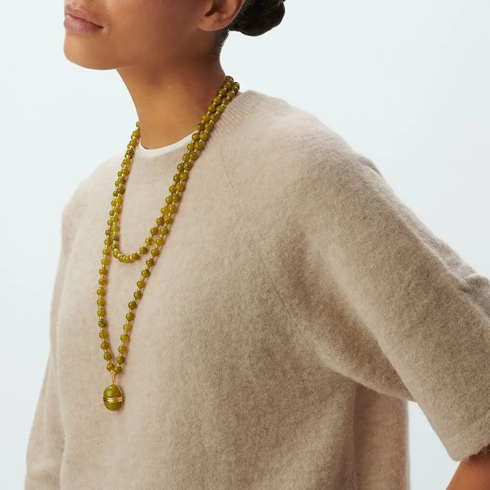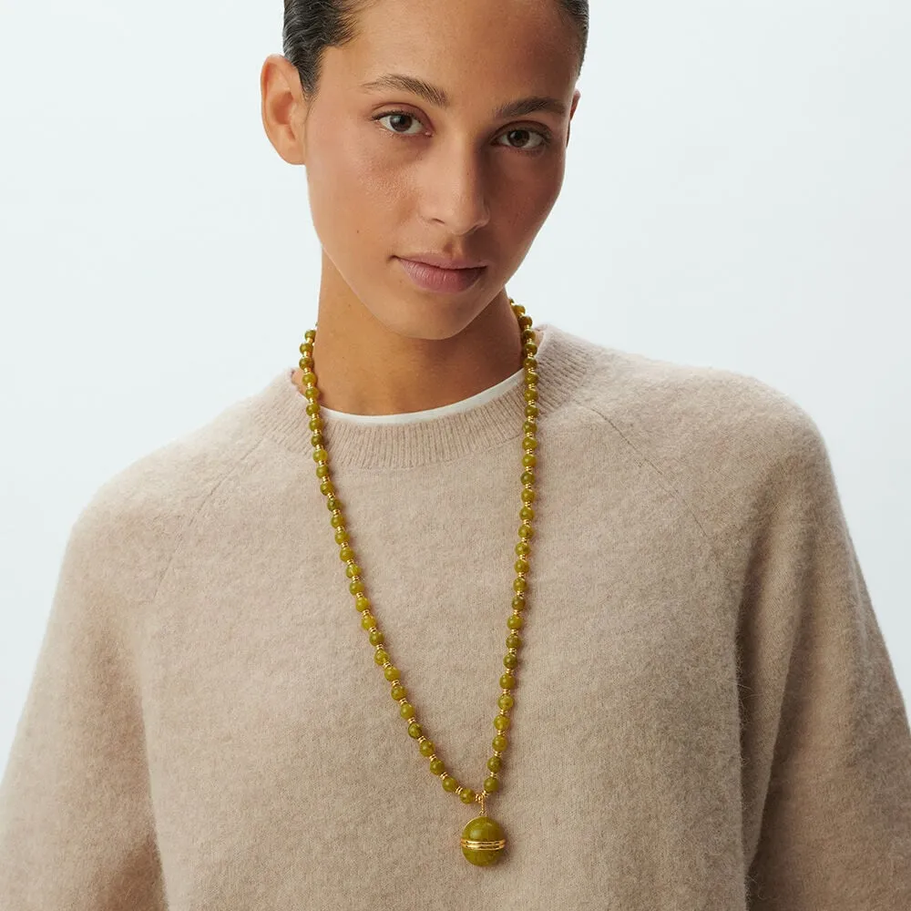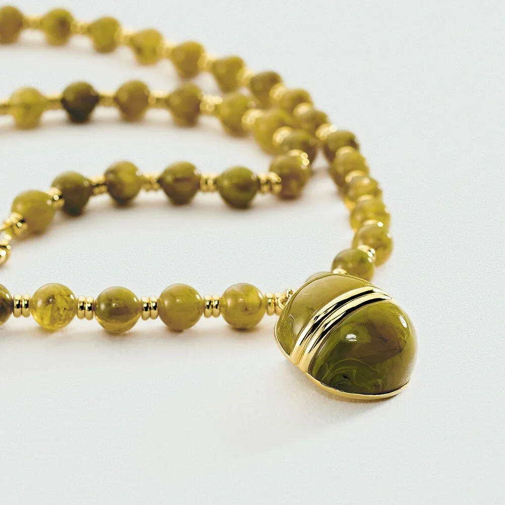 Collar de longitud extendida elaborado en acetato color verde caqui con cabujón a tono coordinado. Diseño de la colección BE by María Pombo que aporta personalidad definitiva a todos tus conjuntos y atrapa todas las miradas. Perfecto para combinar con criollas y anillo a tono creando un total look coordinado impactante. Joya que captura miradas con elegancia parisina. Pieza versátil ideal para múltiples ocasiones.