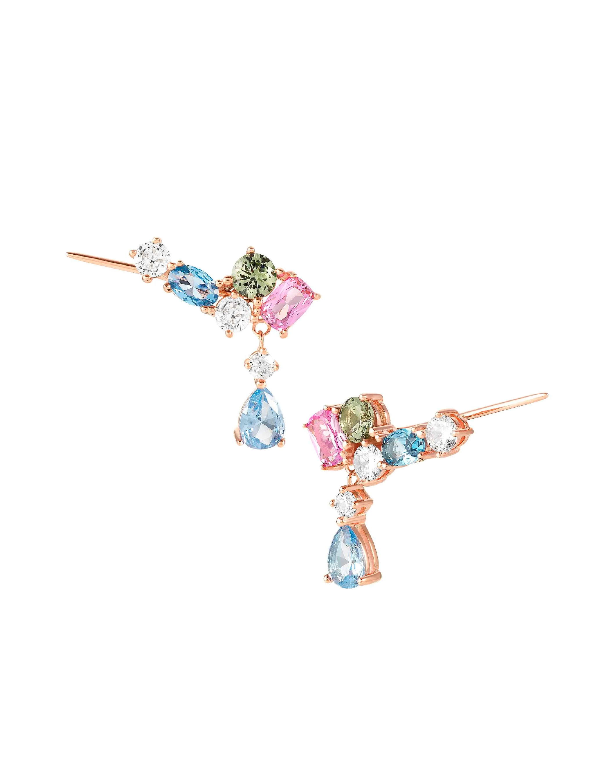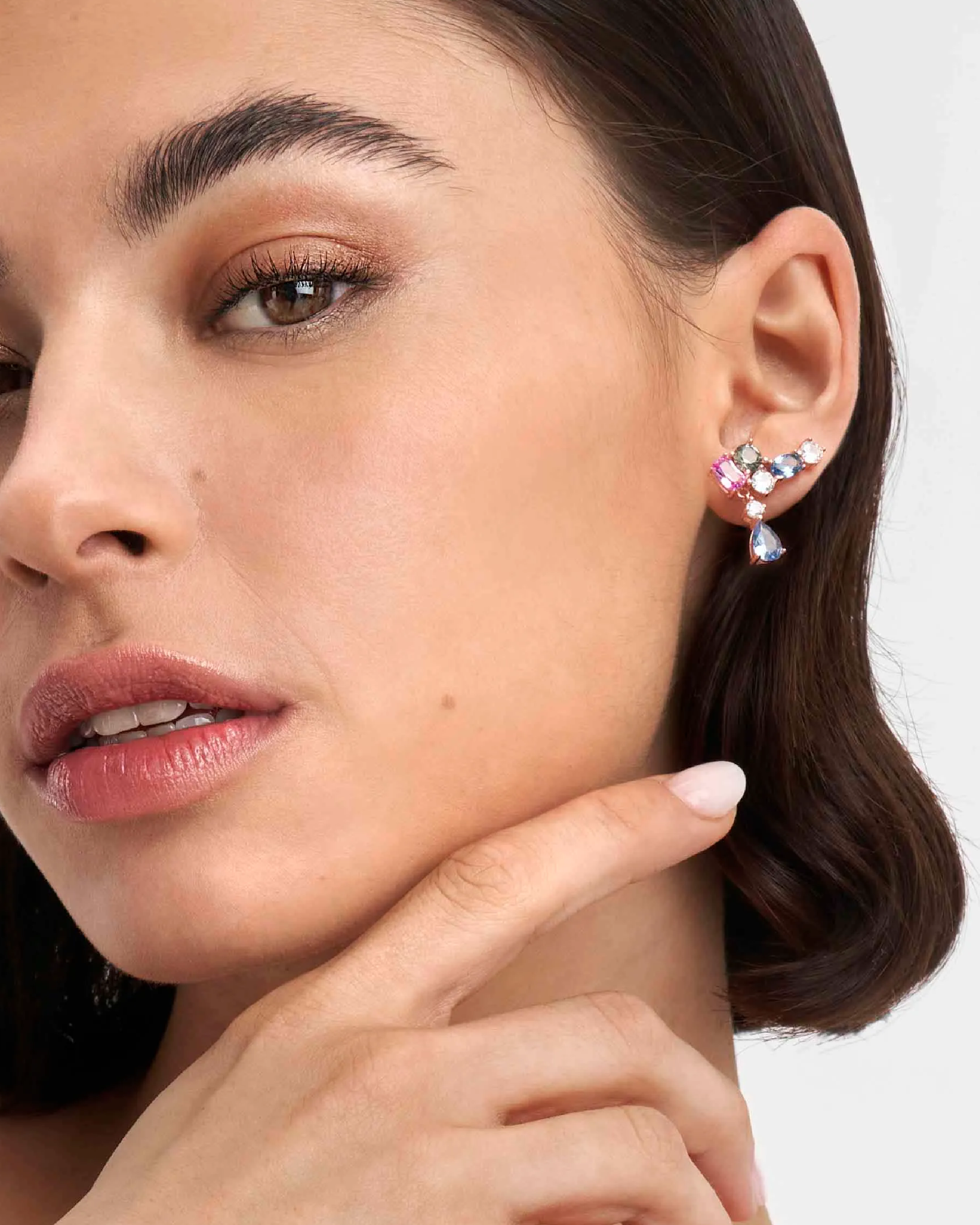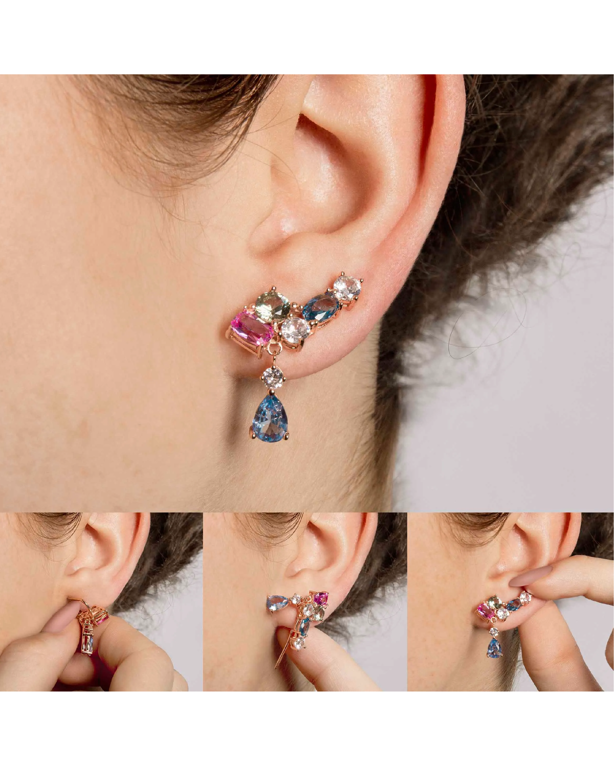 Pendientes en Plata 925 con Cubic Zirconia en un mix de colores. Disponibles con acabado en Rodio blanco o en Oro Rosa realizado mediante baño galvánico. Medida: 2,1×2,1 cm. Made in PRC. ¡Unos pendientes que seguro no pasan desapercibidos!