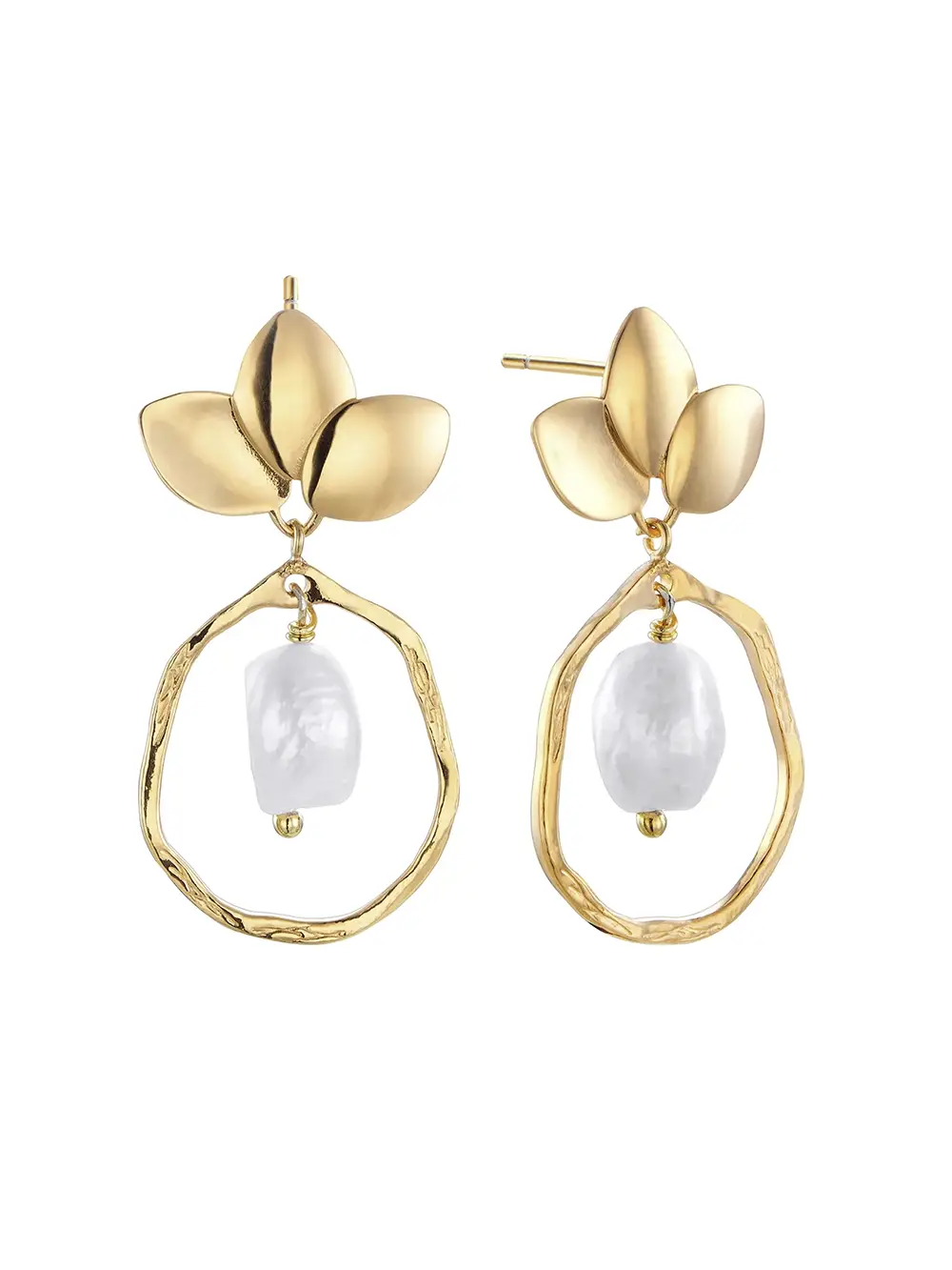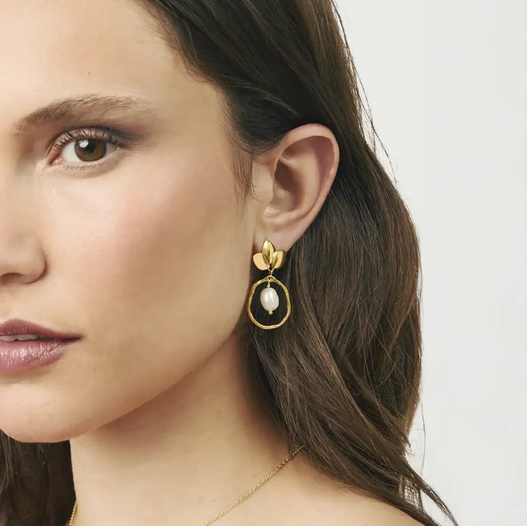 Pendientes de la colección Coco de Durán Exquse fabricados en plata dorada y adornados con una perla barroca. Una pieza llamativa y refinada perfecta para ocasiones especiales.