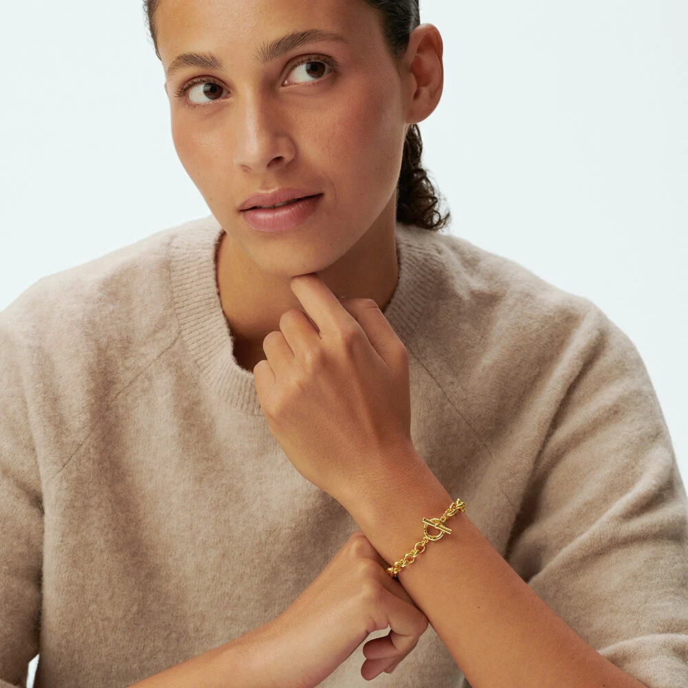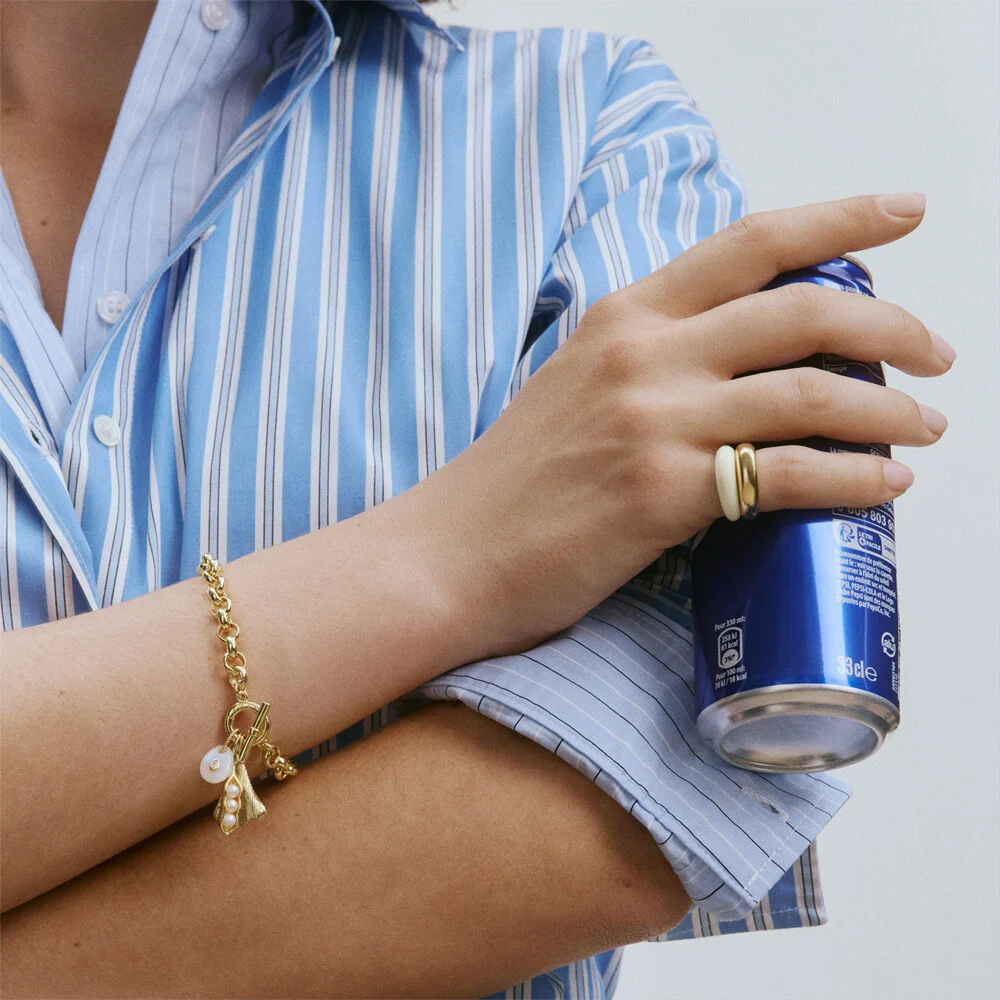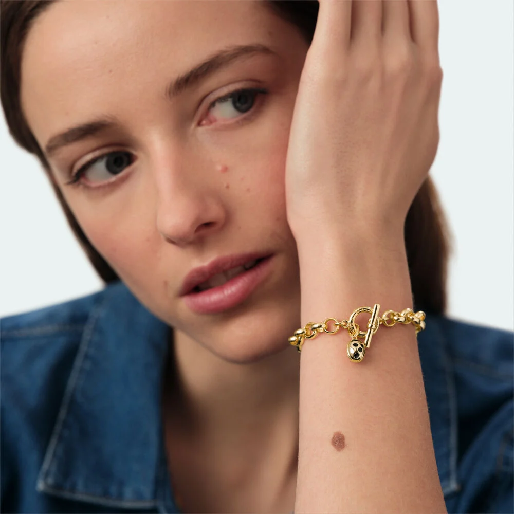 Pulsera Agatha Paris de la colección Gambetta con una silueta actual y muy combinable. Presenta pulsera de malla jaseron dorada con cierre bâton, un detalle que aporta textura y personalidad a la muñeca. Es una pieza cómoda de llevar, perfecta para dar un acento chic tanto a looks sencillos como a conjuntos más cuidados. Su diseño encaja muy bien sola o combinada con otras joyas de la misma línea. El cierre delantero tipo bâton refuerza su personalidad y facilita su uso. Forma parte del concepto Talismans, pensado para personalizar la joya con colgantes.