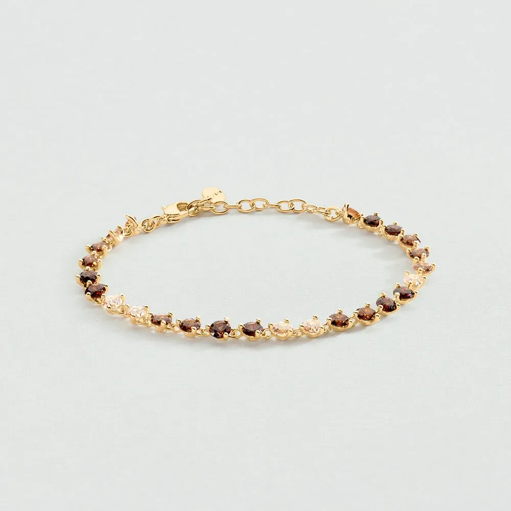 La pulsera de cadena Lutetia de Agatha Paris combina un acabado dorado con circonitas en tonos marrones, creando un juego de colores cálidos muy favorecedor sobre la piel. Su longitud ajustable permite adaptarla cómodamente a la muñeca, mientras los motivos con piedras aportan brillo y un toque sofisticado sin resultar recargados. Es una pieza ideal para quienes quieren incorporar los tonos tierra a sus joyas de diario.