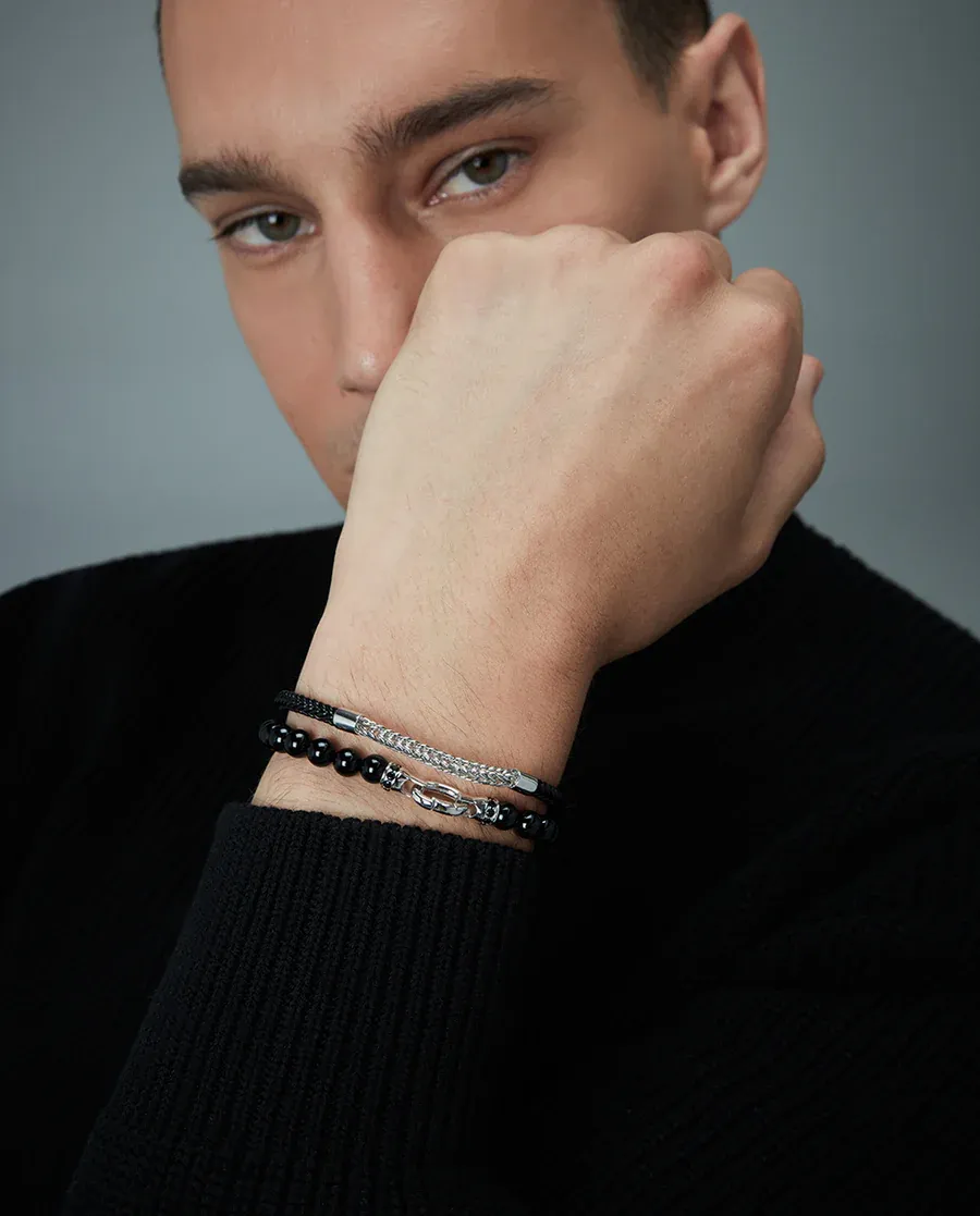 Pulsera Viceroy para hombre en plata de primera ley con baño de rodio y detalle de piel negra, pensada para quienes buscan un accesorio actual y fácil de combinar. La pieza mezcla una parte central metálica pulida con segmentos de piel que aportan textura y un punto casual. El cierre metálico asegura un ajuste cómodo y la longitud regulable permite adaptarla a diferentes muñecas. Es perfecta para acompañar relojes de estilo urbano o para llevar sola como pulsera protagonista, aportando un toque de personalidad tanto en looks informales como en conjuntos más arreglados.
