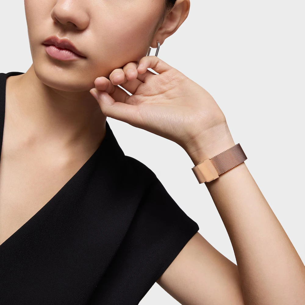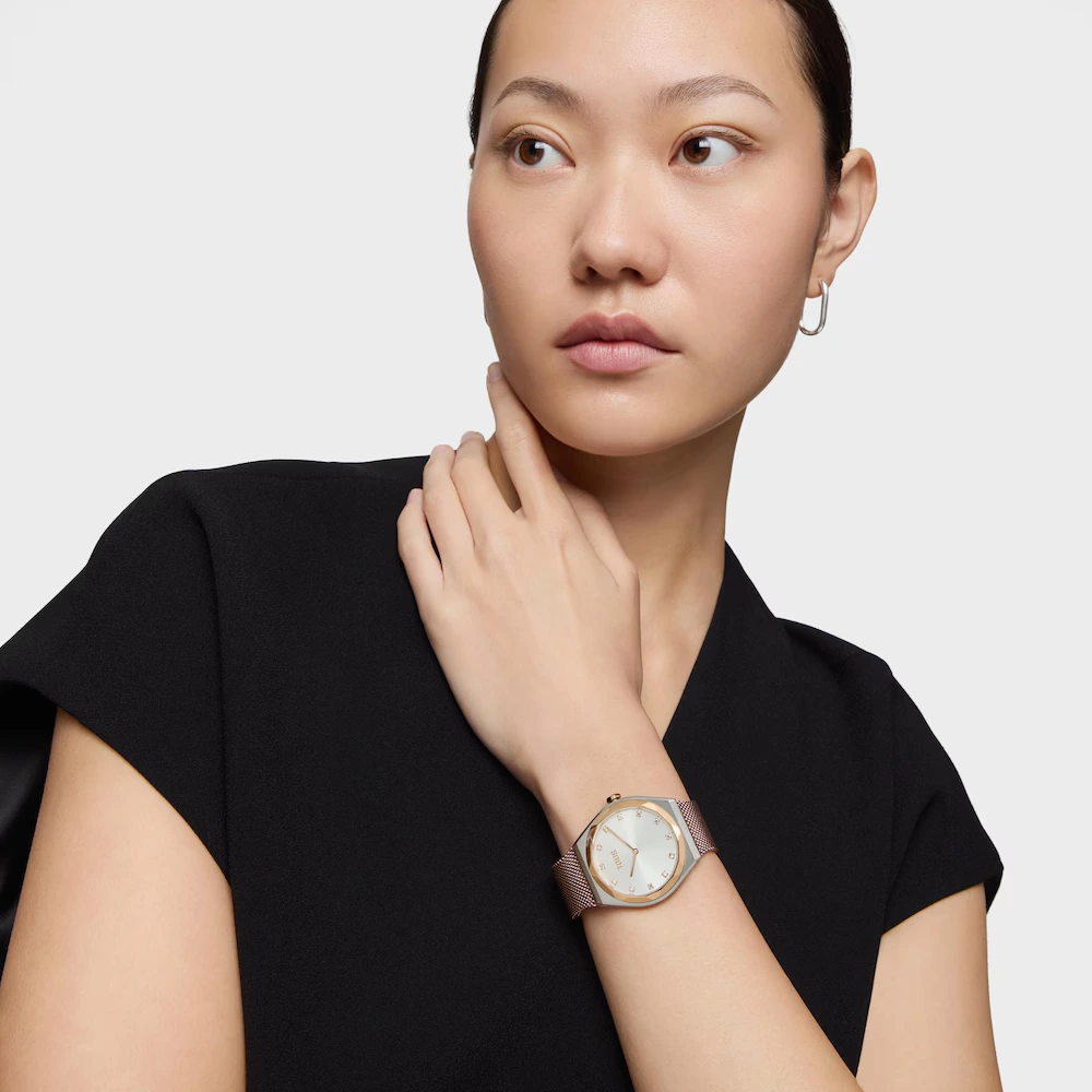 Reloj analógico TOUS Karat Round Mesh con caja redonda y brazalete de acero que combina acabados acero y tono rosa, creando un efecto bicolor muy favorecedor. La esfera destaca por sus índices con brillo tipo cristal, que captan la luz y aportan un toque de joya al conjunto. Incorpora movimiento de cuarzo fiable, cristal mineral y resistencia al agua hasta 3 ATM, ideal para lucir a diario con total tranquilidad. Es un reloj femenino y actual, perfecto para elevar looks sencillos o acompañar estilismos de noche sin recurrir a piezas demasiado recargadas.