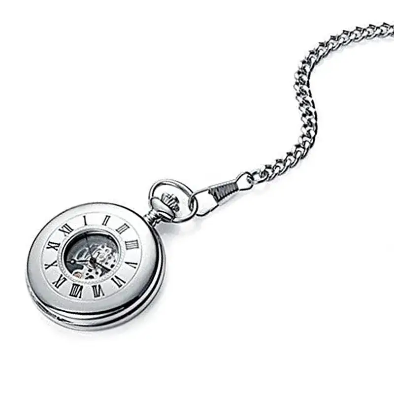 Reloj de bolsillo Viceroy con movimiento mecánico de cuerda manual y diseño tipo esqueleto. Caja de metal plateado de 47 mm, esfera blanca con números romanos y cristal orgánico curvado. Incluye cadena plateada y tapa con ventana transparente para ver la hora sin abrir. Ideal para quienes aprecian el estilo clásico con un toque técnico. Incluye estuche y garantía oficial Viceroy.