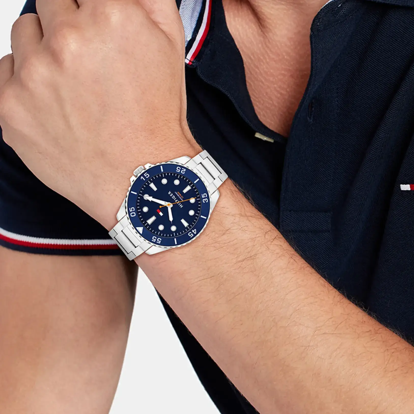 Reloj masculino Tommy Hilfiger con movimiento de cuarzo de tres agujas. Caja de acero inoxidable de 42 mm con bisel de aluminio azul. Esfera azul marino y brazalete metálico con cierre desplegable. Ideal para un look casual con un toque náutico. Resistente al agua hasta 50 metros.