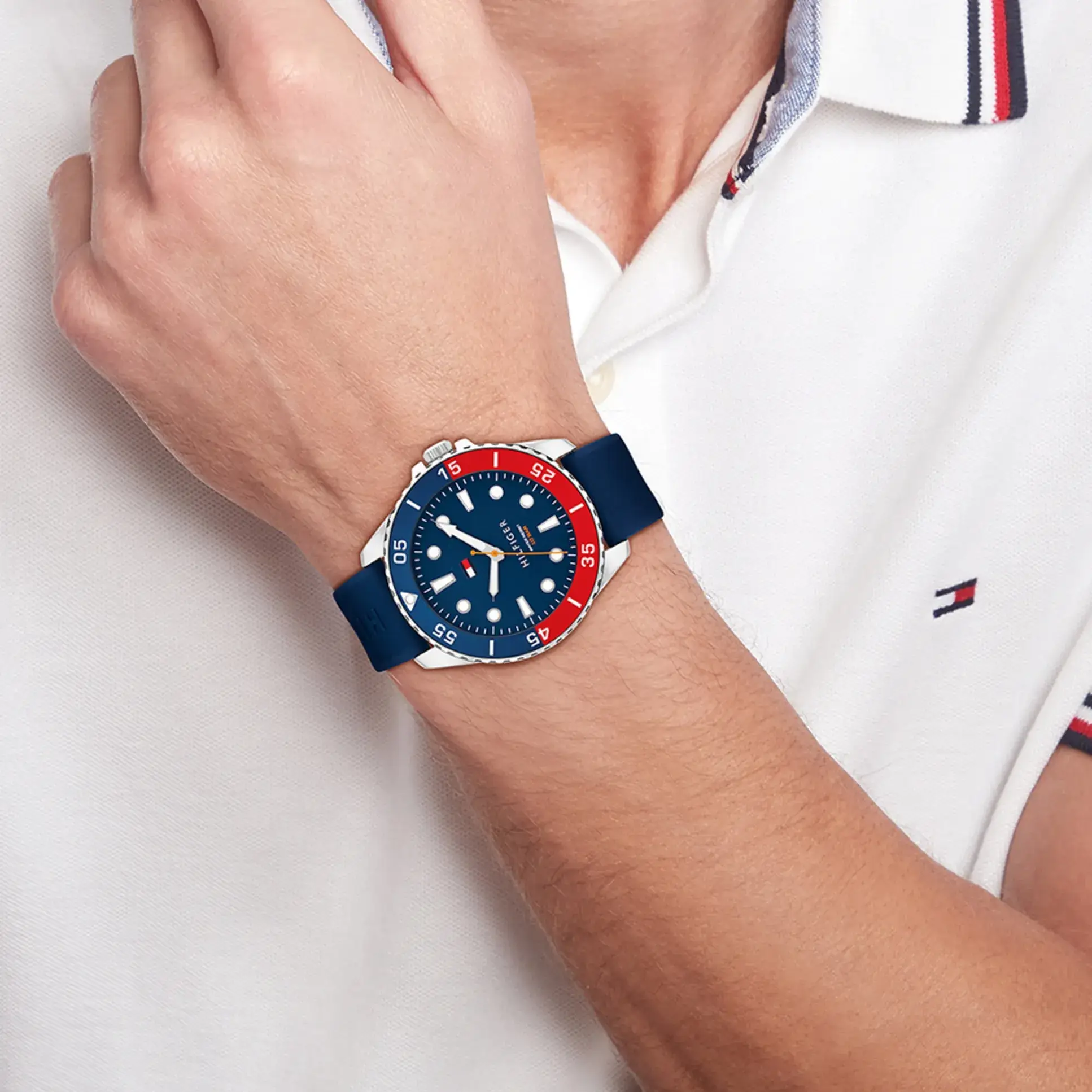 Reloj Tommy Hilfiger de la colección Oceanic con diseño náutico. Movimiento de cuarzo de tres agujas, caja de 42 mm en acero inoxidable, bisel bicolor azul y rojo, esfera azul y correa de silicona azul con cierre de hebilla. Resistente al agua hasta 50 metros.