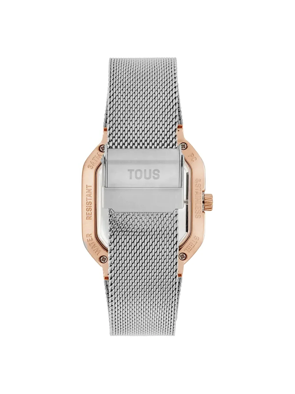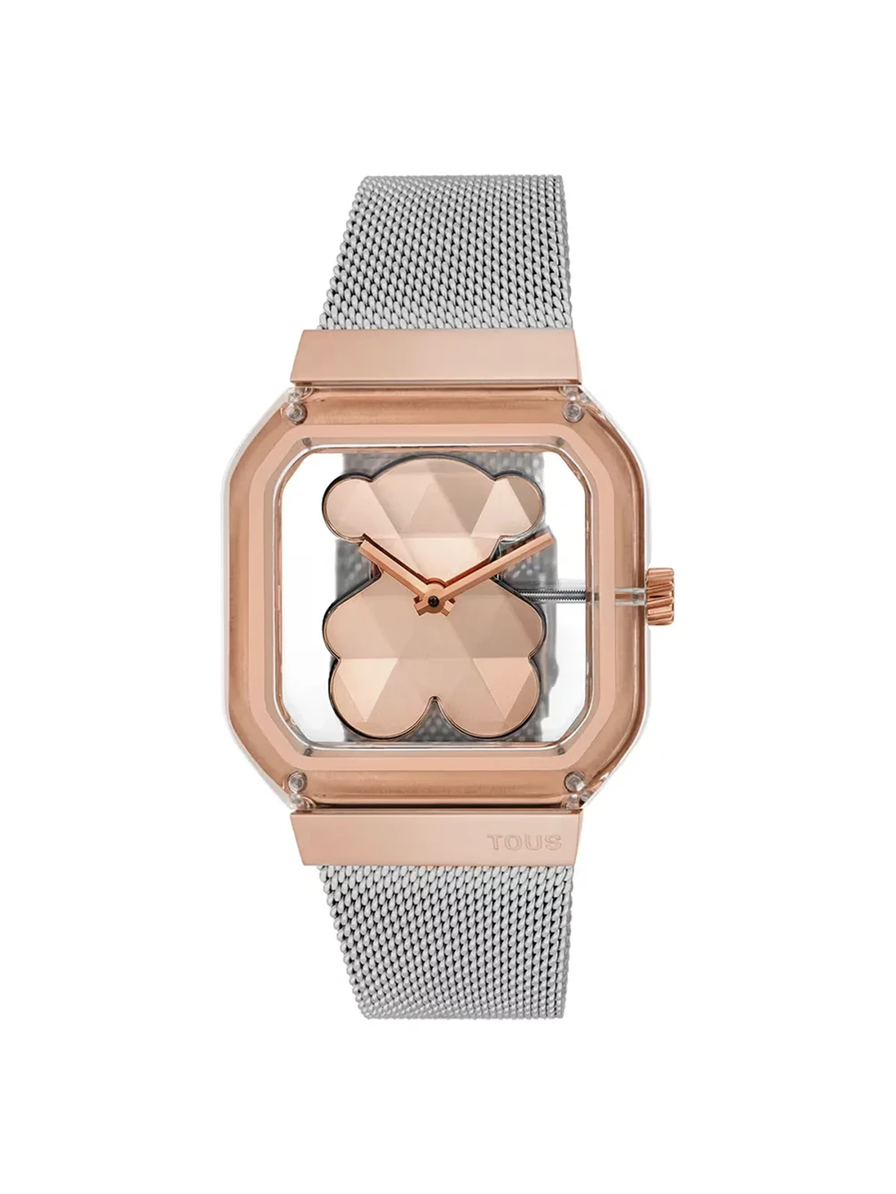 Reloj TOUS D-Bear Party con un diseño sofisticado y femenino. Caja transparente de 36 x 48 mm y esfera metálica con oso facetado acrílico, imitando una gema con un brillo especial. Cristal mineral plano octogonal. Brazalete tipo malla milanesa en acero inoxidable combinado con acero rosado, con cierre de seguridad ajustable. Movimiento de cuarzo japonés, funciones de hora y minutos. Resistencia al agua de hasta 3 ATM. Una pieza versátil y elegante con el sello inconfundible de TOUS.
