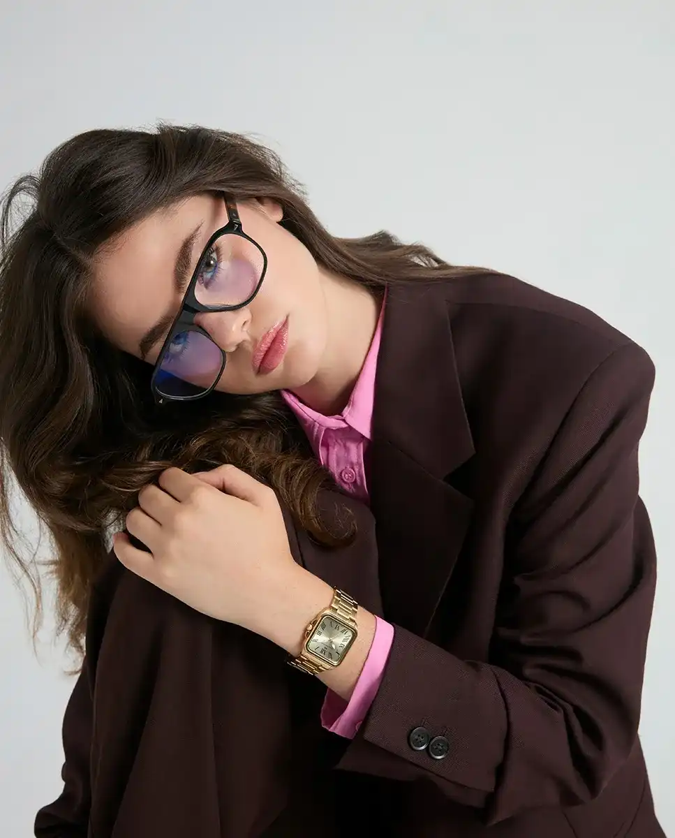 Movimiento de cuarzo analógico que asegura precisión constante. Brazalete integrado con eslabones articulados que abrazan