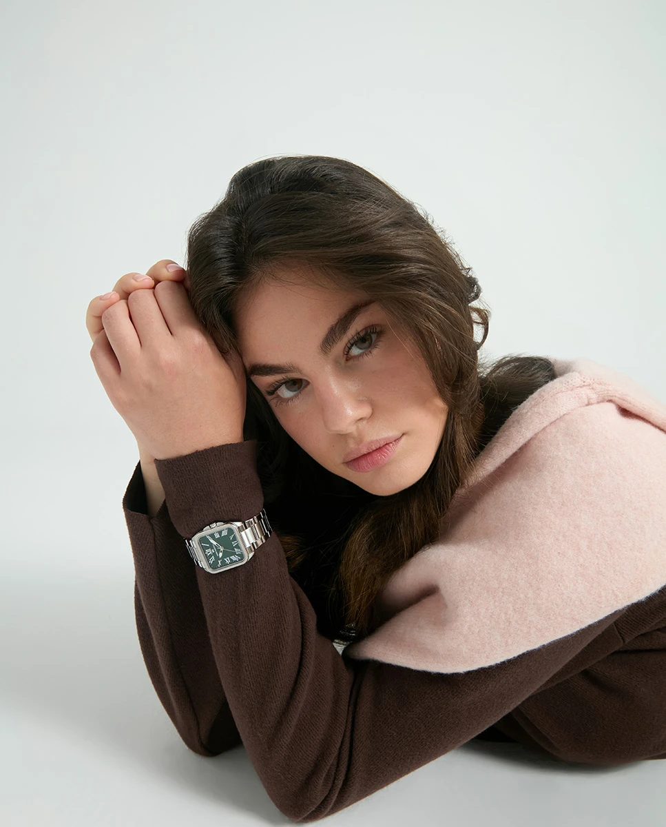 Modelo femenino de estética depurada con líneas minimalistas. Construido en acero inoxidable de calidad con acabados