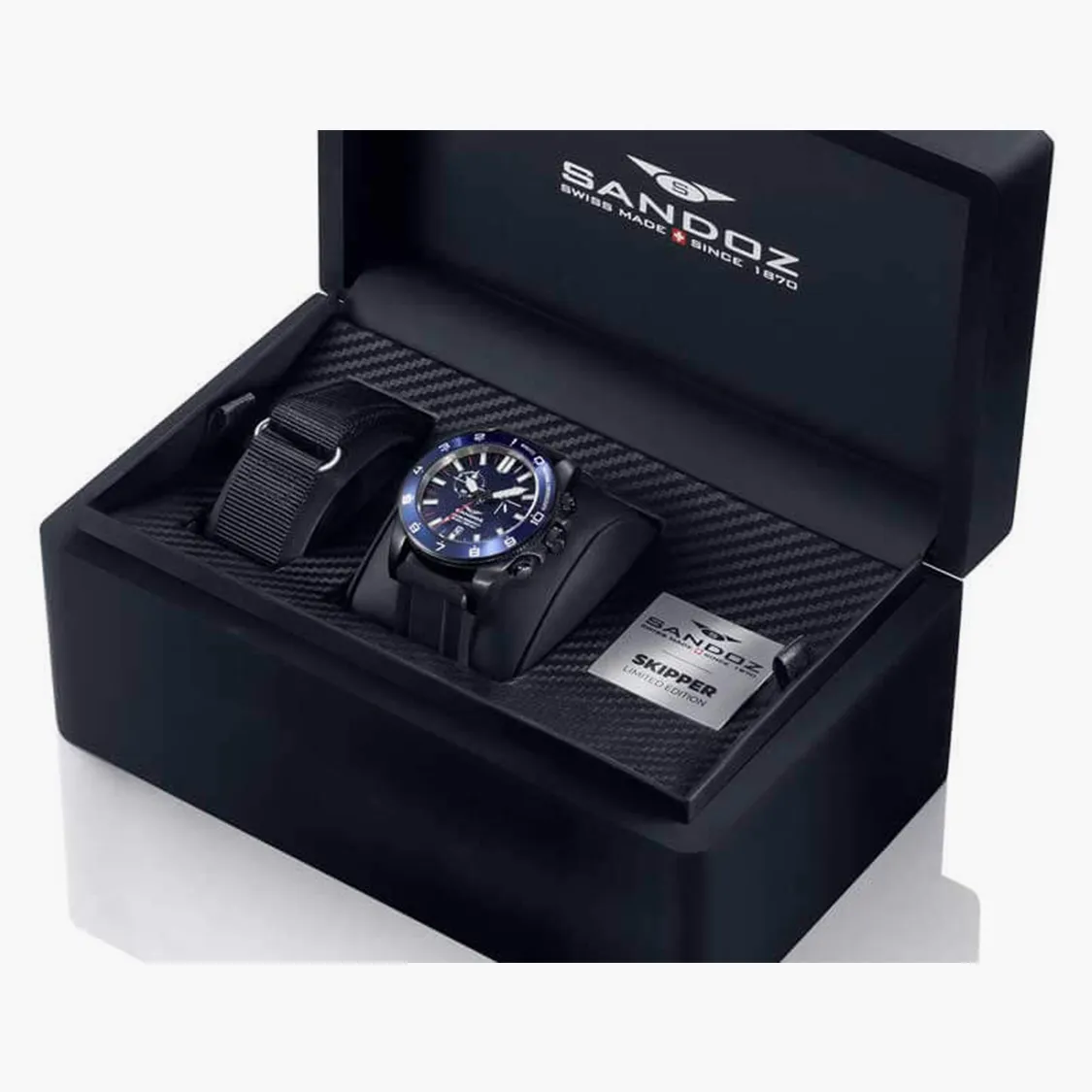 El Sandoz Skipper Limited Edition combina la precisión suiza con las particularidades de un reloj náutico de altas prestaciones. Su mo- vimiento especial cronógrafo con funciones de regata permite controlar el tiempo con la máxima precisión, incluso en las situaciones más extremas. Esta edición limitada Skipper mantiene así mismo todas las funcionalidades y características de la colección Diver, pensada para los amantes de los deportes acuáticos y las emociones extremas.