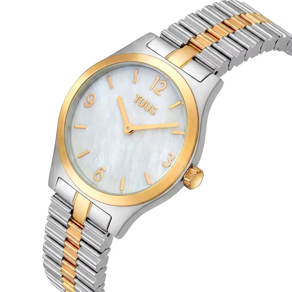 Nácar, acero dorado y el oso de la firma: la esencia joyera de TOUS en estado puro. El brazalete bicolor y la esfera nacarada de 31 mm crean una pieza de relojería que trasciende la función y se convierte en complemento de autor para cada instante. Reloj analógico Epic Icon. Caja y brazalete de acero inoxidable combinado con acero dorado. Diámetro: 31 mm. Esfera de nácar. Cristal mineral plano redondo. Resistente al agua 5 ATM. Movimiento de cuarzo japonés Miyota GL22. Cierre de mariposa con pulsadores.