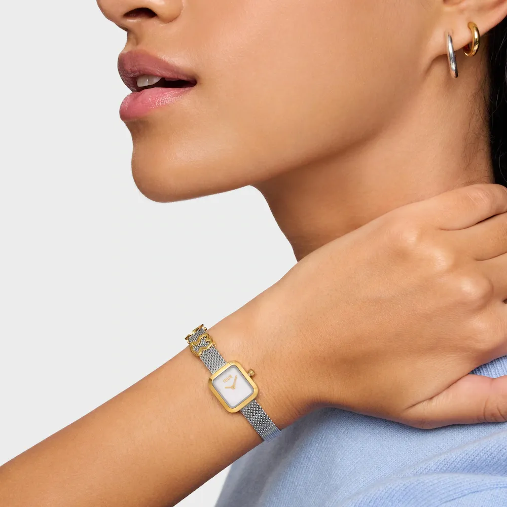 La colección Icon Time Charms añade al universo del nácar y el acero dorado un toque de fantasía: motivos oso y corazón se despliegan por el brazalete de malla milanesa convirtiendo cada detalle en un guiño joyero lleno de herencia y modernidad. Reloj analógico Icon Time Charms. Caja de acero dorado y brazalete de malla milanesa con motivos oso y corazón en acero dorado. Medidas: 16×18,7 mm. Cristal mineral plano redondo. Esfera de nácar. Resistente al agua 3 ATM. Movimiento de cuarzo japonés. Cierre de malla milanesa.