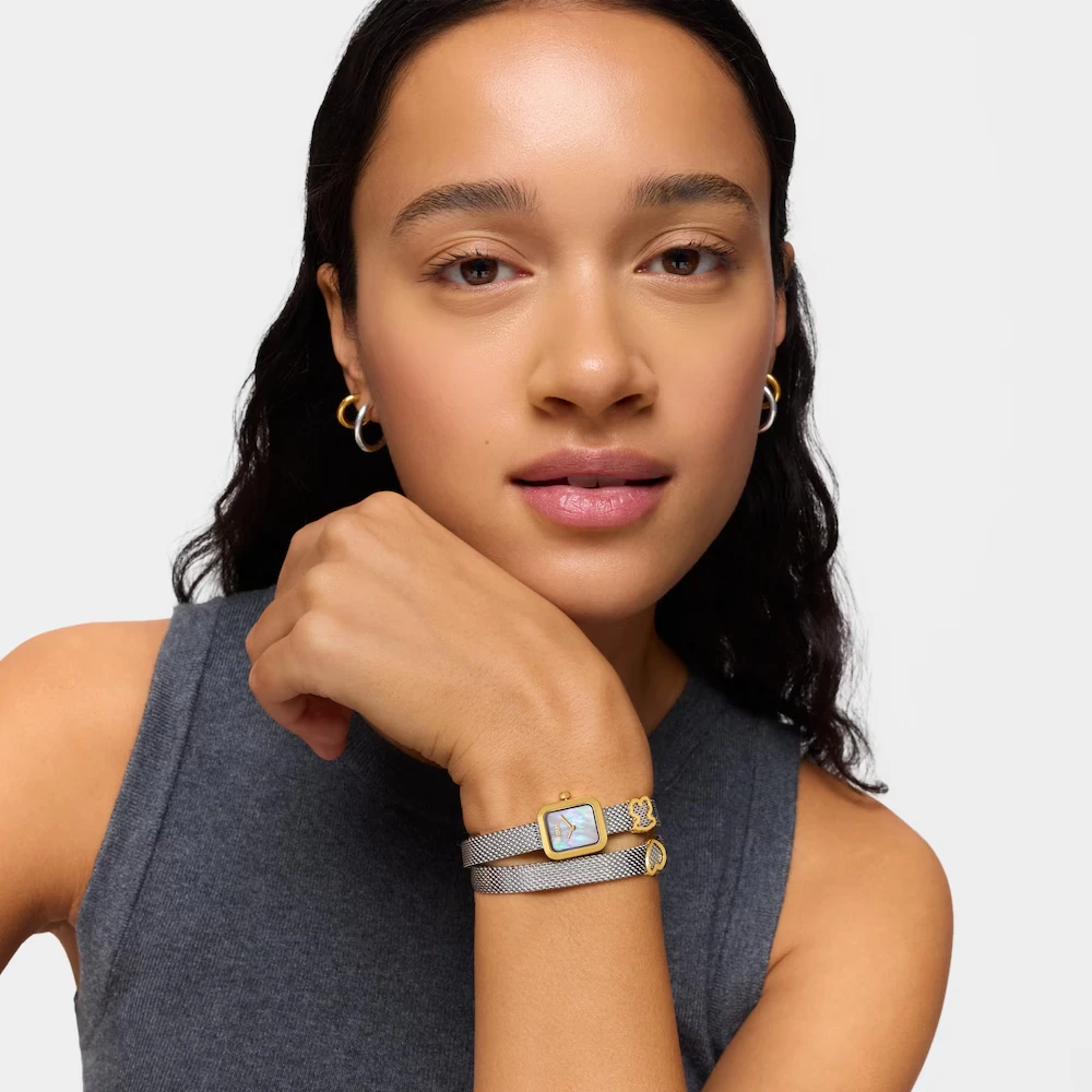 El tiempo se convierte en joya cuando el nácar, el acero dorado y los iconos de la firma se funden en una sola pieza. Tradición relojera y espíritu joyero se abrazan en un diseño de silueta rectangular que eleva la muñeca a símbolo de presencia y estilo. Reloj analógico Icon Time Embraced. Caja y brazalete de malla milanesa de acero dorado con motivos oso y corazón. Medidas: 16×18,7 mm. Cristal mineral plano rectangular. Esfera de nácar. Resistente al agua 3 ATM. Movimiento de cuarzo japonés. Cierre de malla milanesa.