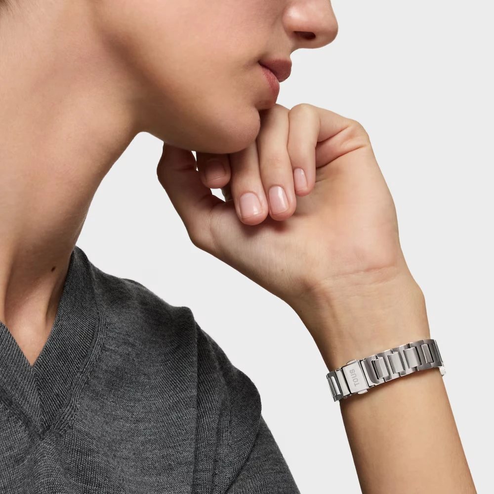 Un pequeño símbolo que une generaciones: la dulce silueta del oso TOUS, ahora en formato mini, transforma el reloj de pulsera en algo más que un accesorio. Compacto y contemporáneo, combina ternura y elegancia en un diseño que se convierte en recuerdo compartido. Reloj digital D-Bear Mini. Caja y brazalete de acero inoxidable. Medidas: 27×34,5 mm. Cristal mineral plano cuadrado. Pantalla LCD iluminada. Resistente al agua 3 ATM. Pila CR1620 3V. Funciones: hora 12/24h, minutos, segundos, fecha, día, cronógrafo 1/100s y alarma. Cierre desplegable con pulsadores.