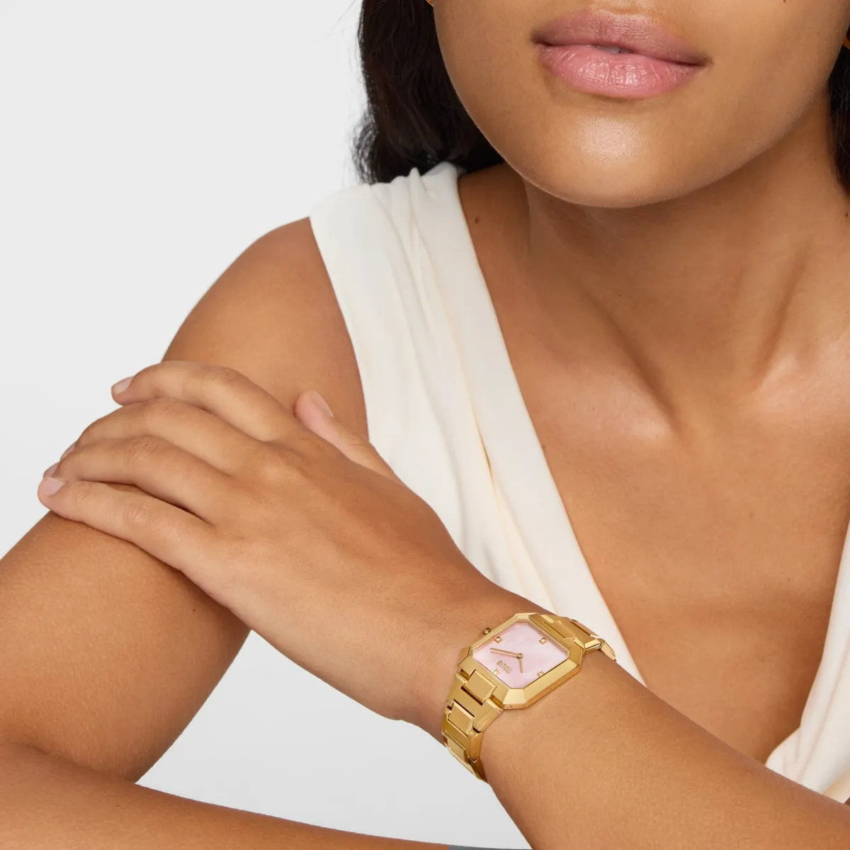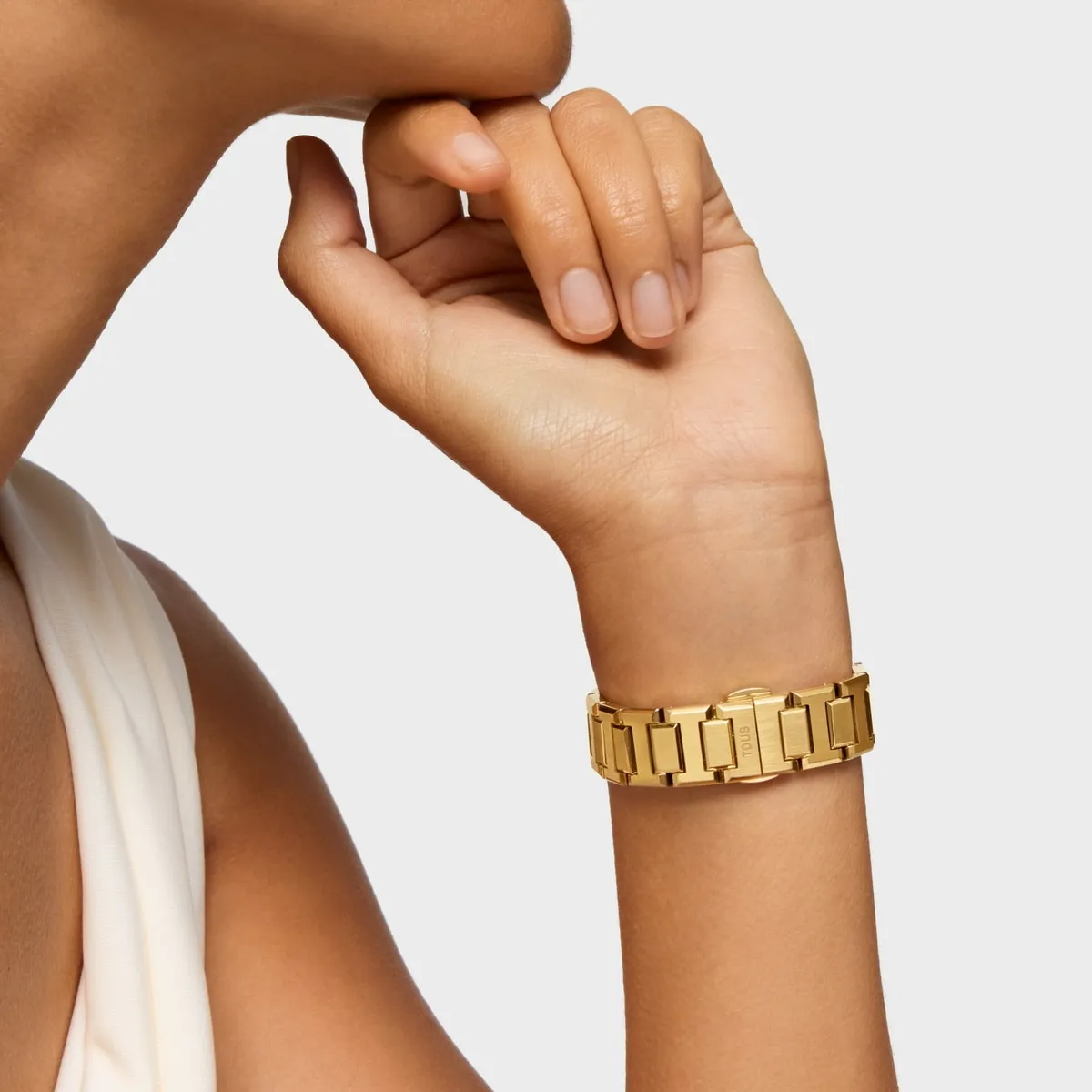 Reloj TOUS Karat con brazalete de acero dorado, esfera de nácar rosa con cristales en índices y cierre mariposa con pulsadores.