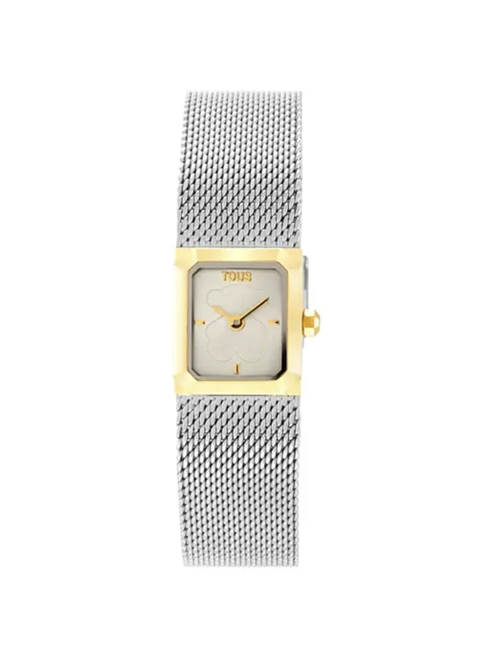 Reloj analógico TOUS Mini Mesh con un diseño bicolor que combina acero inoxidable con detalles en dorado. Caja de forma octogonal con cristal mineral plano, funciones de hora y minutos, y resistencia al agua de 3 ATM. El brazalete de malla milanesa ajustable incorpora un cierre de seguridad para mayor confort y estilo.