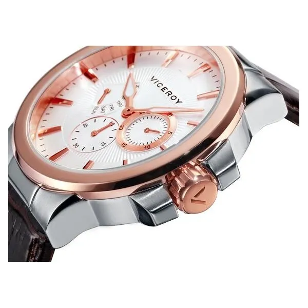 Reloj Viceroy de hombre acero dorado con correa de piel marrón, indicadores múltiples y resistente al agua 100 m 47827-07