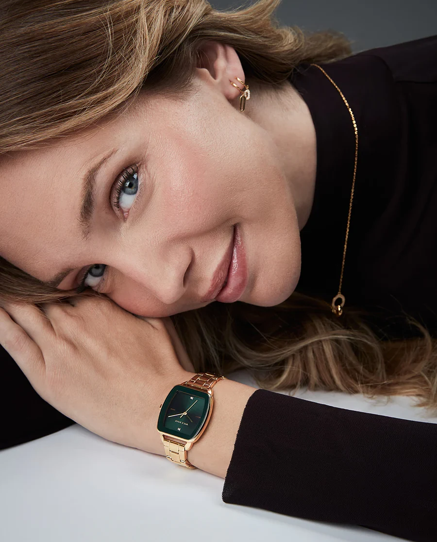 Este reloj combina elegancia y color en su caja rectangular de acero dorado. La esfera y bisel en tonos verdes contrastan con índices tipo barra dorados embellecidos con cristales brillantes, creando un efecto luminoso y sofisticado.