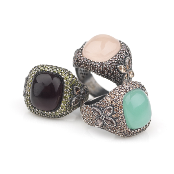 En cada colección Sunfield hay diseños para las más atrevidas y Giselle in Paris no será diferente. Está fabricado en plata de ley 925 con acabado envejecido y tiene como protagonista en su centro un cabujón de 14×12 mm de calcedonia acompañado de una combinación de circonitas champagne y brown que lo hacen irresistible.