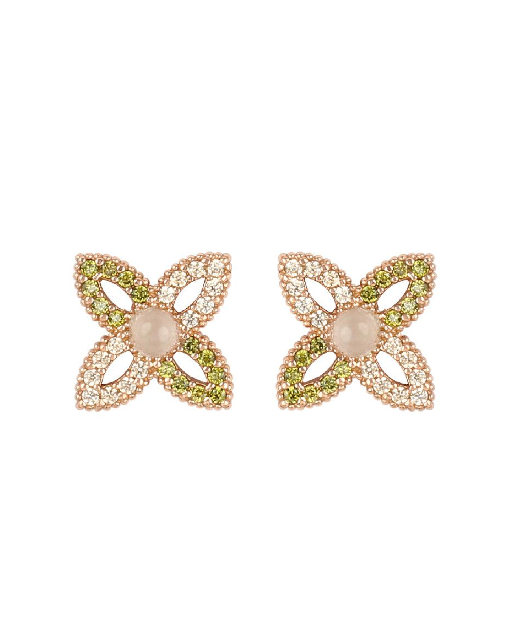 Tienen un baño de oro rosa de 24 kilates, y un cabujón en cuarzo rosa en el centro. Las circonitas de 1,25mm talla brillante en colores cava y verde han sido clavadas a mano una a una por nuestros joyeros, lo que hace de estos pendientes una joya tan especial.