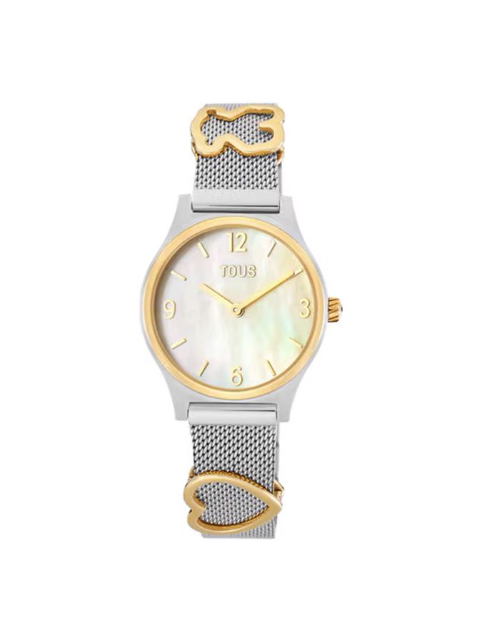 Inspirado en la joyería icónica de TOUS, este reloj destaca por su esfera de nácar y símbolos distintivos de la marca como el oso y el corazón, creando un diseño único y emotivo.