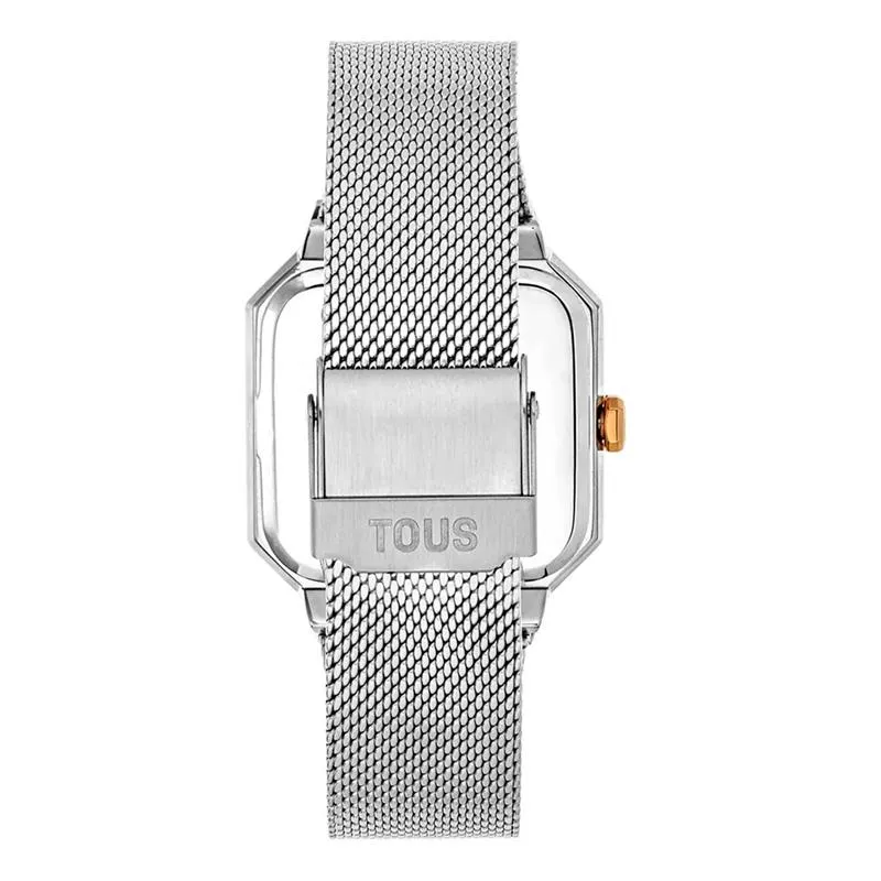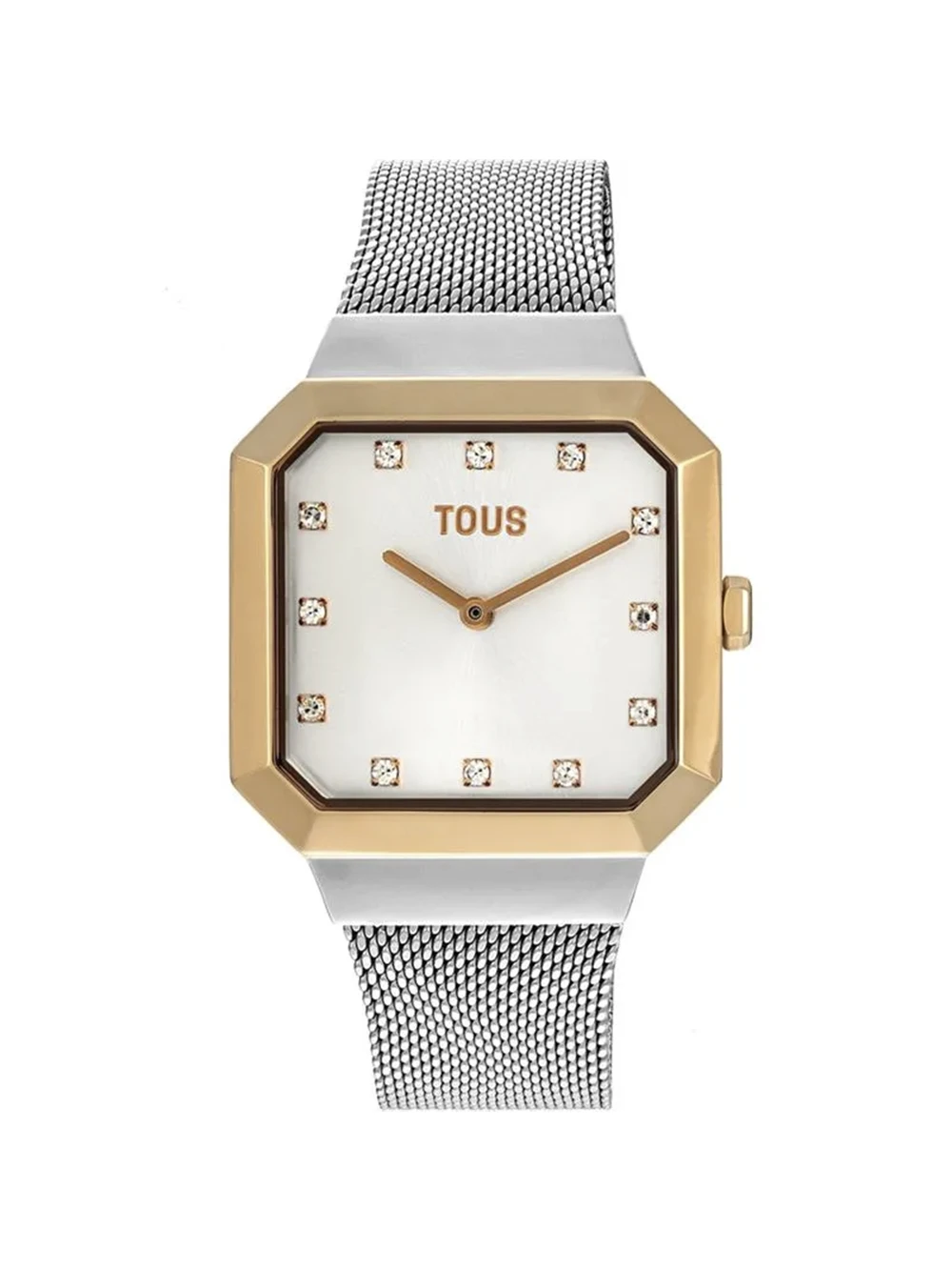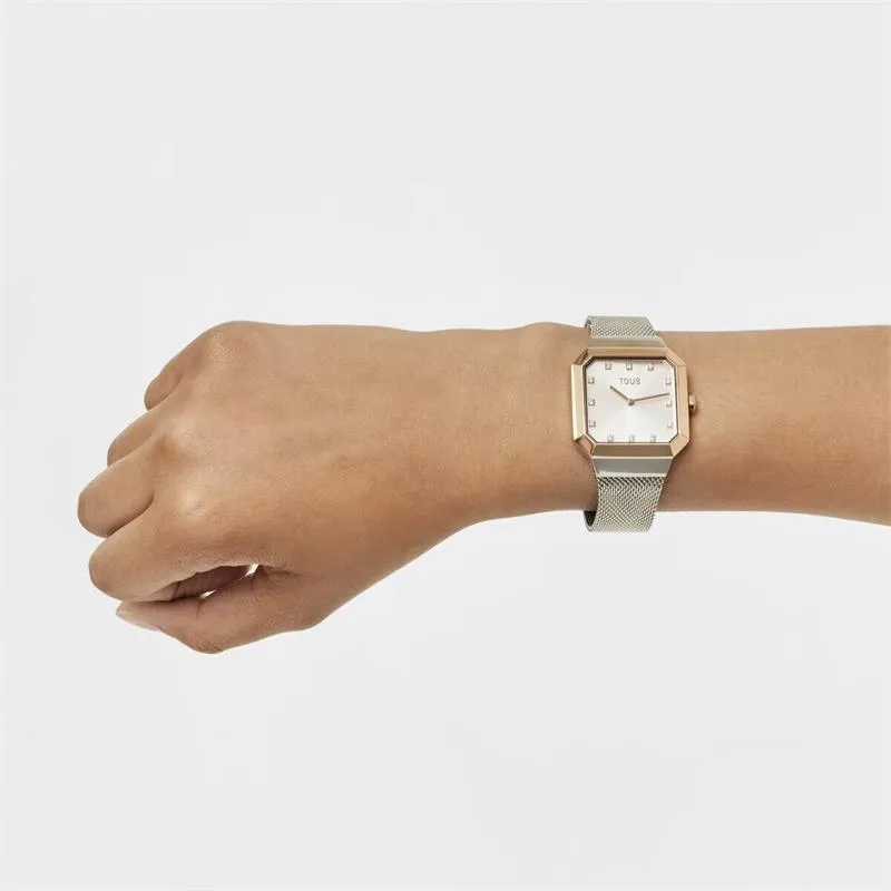 Reloj TOUS Karat Squared para mujer, diseño cuadrado de acero en tonos rosado y plateado, con índices de cristales brillantes y correa de malla milanesa ajustable.