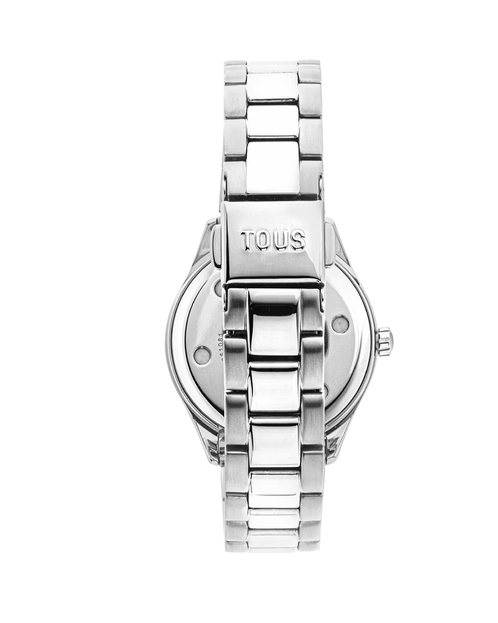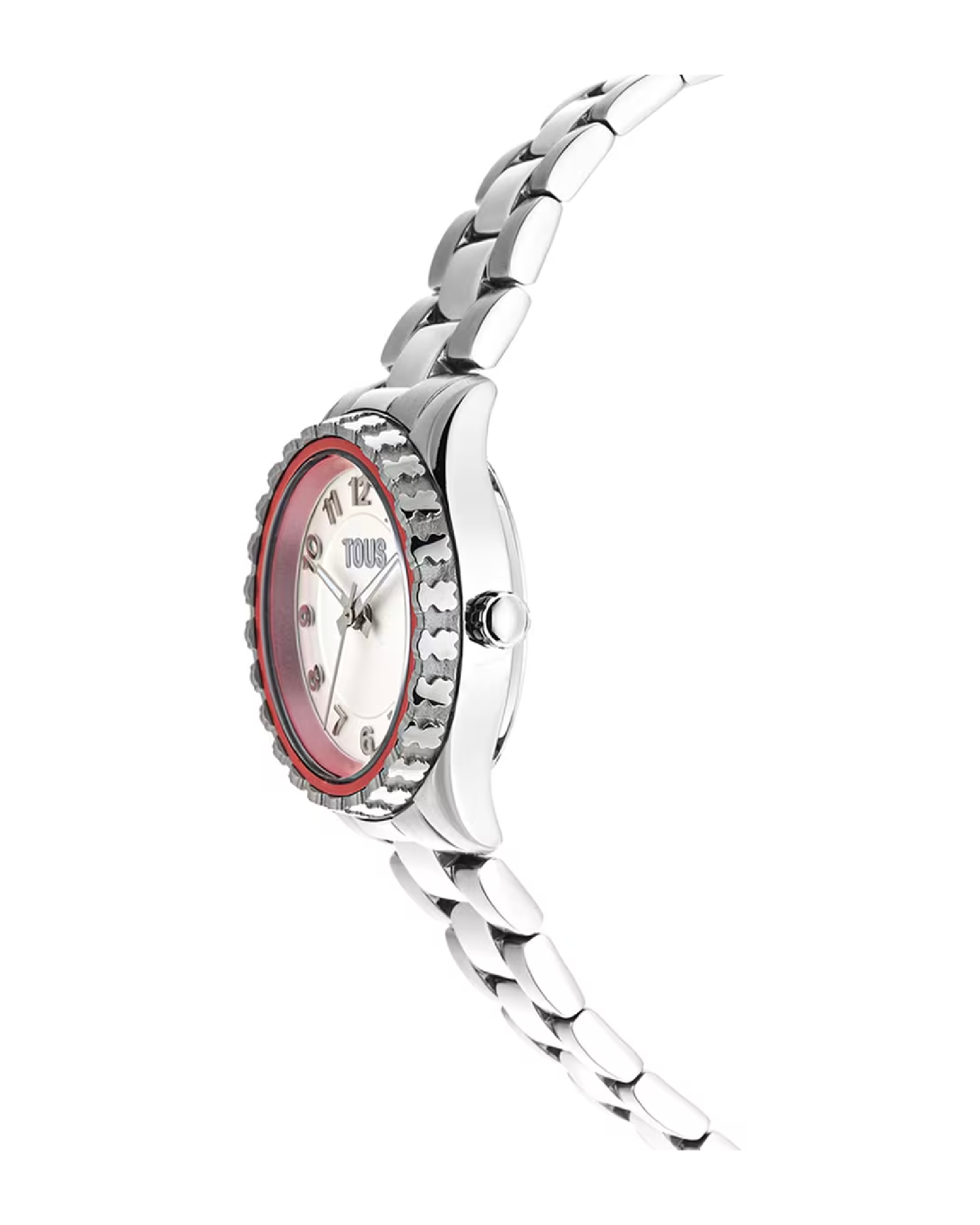 Reloj analógico TOUS Mini T-Bear con brazalete de acero inoxidable 316L y bisel interior de aluminio en color rosa, diámetro 28,2 mm y bisel con osos en relieve. Funciones: hora, minutos y segundos. Impermeable a 5 ATM. Batería: 1,55V Oxido de plata SR621SW/0,4 gramos. Movimiento cuarzo japonés. Cierre desplegable con pulsadores.