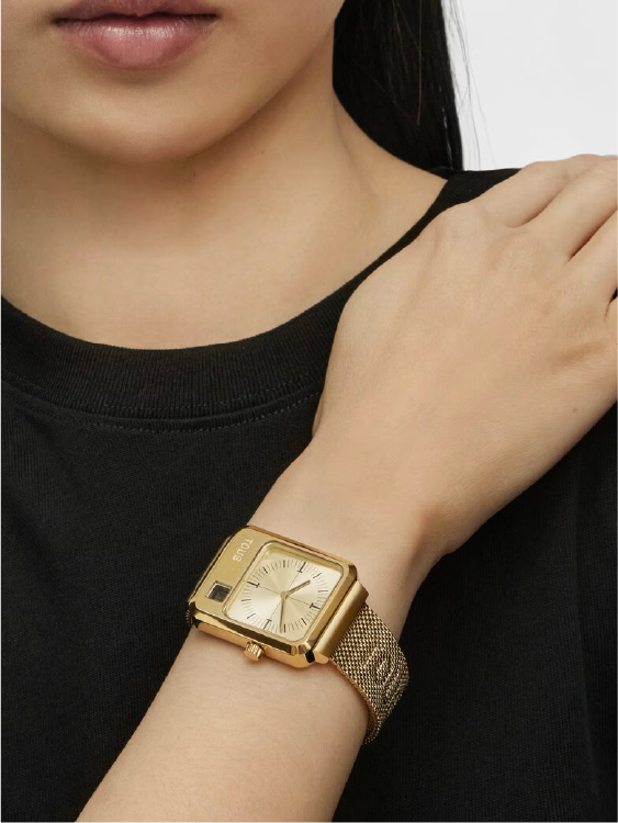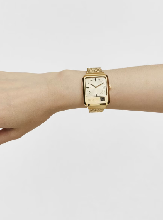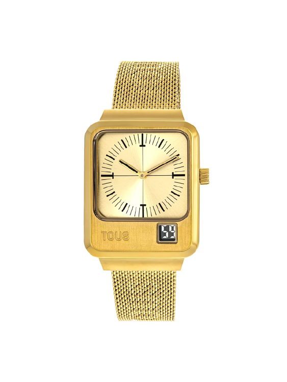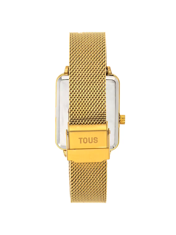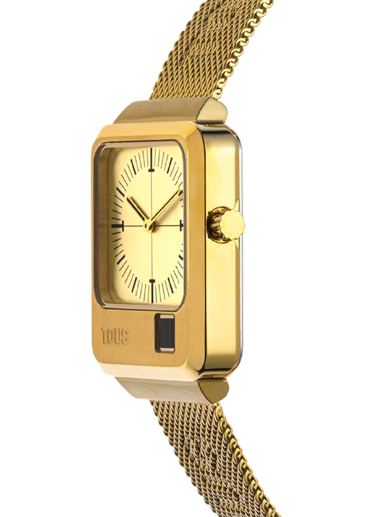 Reloj analógico y digital TOUS MARS con brazalete de acero IPG dorado. Dimensiones caja: 30,5 x 43,2 mm. Funciones: hora y minutos en analógico y segundos en digital. Impermeable a 3 ATM. Batería: 1,55V Oxido de plata SR621SW/0,3 gramos. Cristal: mineral rectangular plan en analógico y digital. Movimiento cuarzo japonés. Cierre de malla milanesa con cierre de seguridad.