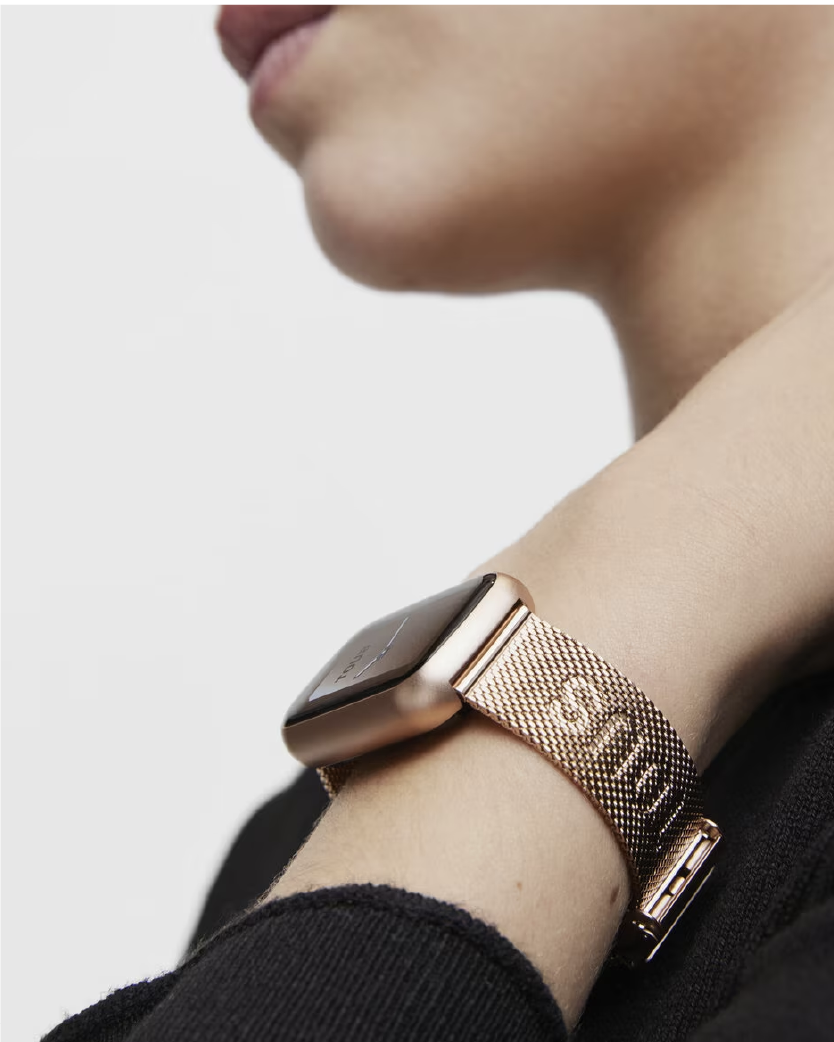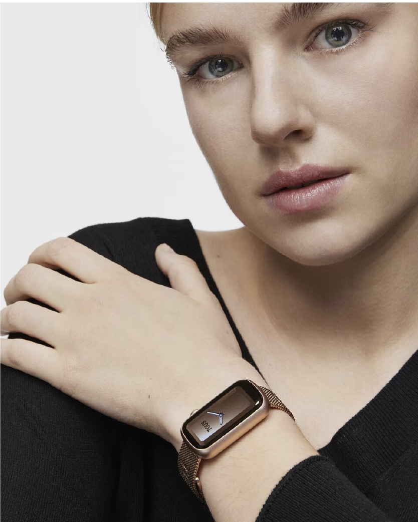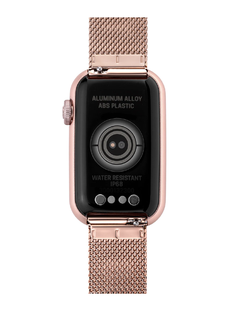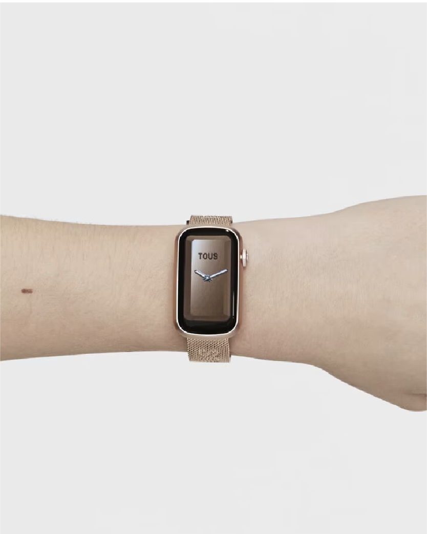 Reloj smartwatch TOUS T-Band Mesh con brazalete de acero inoxidable IPRG rosado y caja de aluminio en color rosado. Compatibilidad: Android 7.0 y iOS 12.0 o superior. Pantalla/LDC: táctil rectangular de 1,47 pulgadas TFT-DLC en color (Full Touch) con resolución de 172 x 320. Sistema operativo: RT OS. Conectividad: Bluetooth versión BLE 5.0. Ganancia de la antena: 0dbi. Memoria RAM: 128 kb, ROM Flash de 64 MB. Batería: capacidad 140 mAh, acumulador de batería 3.8V Litio/2,9 gr, recargable con cable magnético (min. 5V/1A), 5-7 días en funcionamiento y 8-10 en reposo. Chipset: Realtek RTL8762CK y Frecuencia cardíaca: HRS 3300- ARM Cortex-M3 – 53MHz de velocidad. Impermeabilidad: IP68. Funciones: 5 Esferas TOUS y una puede ser intercambiada desde la TOUS WEAR APP, horas, minutos, mes, día, día de la semana, actividad diaria con contador de pasos, contador de calorías y distancia recorrida en millas o kilómetros, deportes (caminar, correr, senderismo, ciclismo, cinta/elíptica, yoga y basquetbol), frecuencia cardiaca, monitorización del sueño, presión sanguínea (aproximación), oxígeno en sangre (aproximación), notificaciones (llamadas, WhatsApp, email, SMS, Facebook, etc.), clima, función ovárica, cronógrafo 1/10 segundos, control música, encontrar móvil y control cámara. Cierre de malla milanesa con cierre de seguridad.