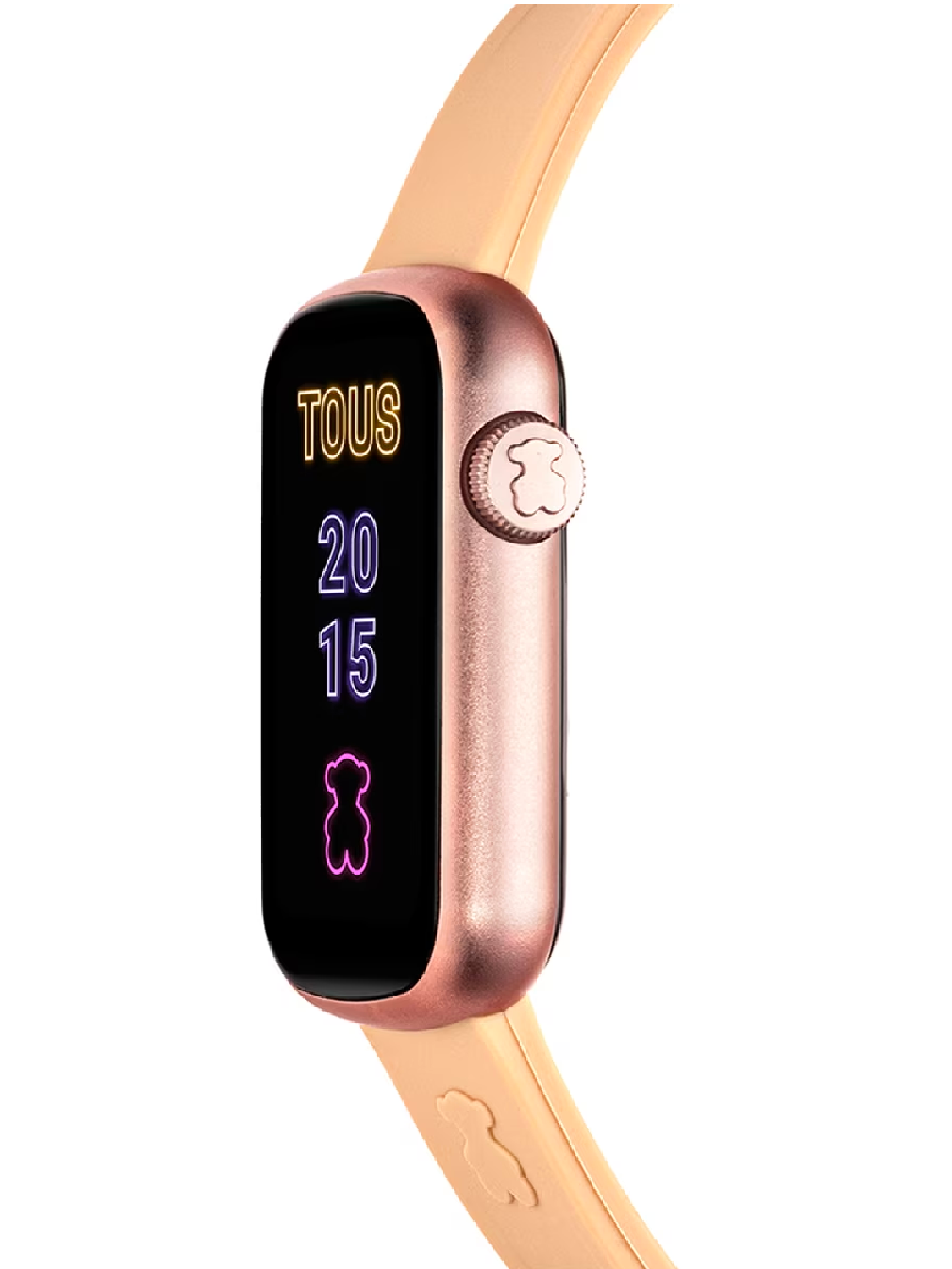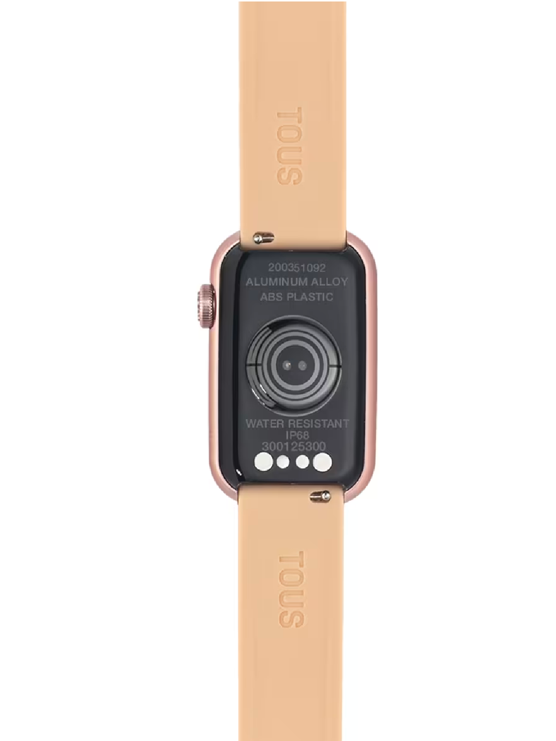 Reloj smartwatch TOUS T-Band con doble correa intercambiable y caja de PC rosado. Correa de nylon con logo rapport en rosa sobre base negra y correa de silicona en color rosa palo con oso posicionado. Compatibilidad: Android 7.0 y iOS 12.0 o superior. Pantalla/LDC: táctil rectangular de 1,47 pulgadas TFT-DLC en color (Full Touch). Sistema operativo: RT OS. Conectividad: Bluetooth versión BLE 5.0. Memoria RAM: 128 kb, ROM Flash de 64 MB. Batería: 140 mAh, acumulador de batería 3.8V Litio/2,9 gr, recargable con cable magnético, 5-7 días en funcionamiento y 8-10 en reposo. Chipset: Realtek RTL8762CK y Frecuencia cardíaca: HRS 3300- ARM Cortex-M0 – 53MHz de velocidad. Impermeabilidad: IP68. Funciones: 5 Esferas TOUS y una puede ser intercambiada desde la TOUS WEAR APP, horas, minutos, mes, día, día de la semana, actividad diaria con contador de pasos, contador de calorías y distancia recorrida en millas o kilómetros, deportes (caminar, correr, senderismo, ciclismo, cinta/elíptica, yoga y basquetbol), frecuencia cardiaca, monitorización del sueño, presión sanguínea (aproximación), oxígeno en sangre (aproximación), notificaciones (llamadas, WhatsApp, email, SMS, Facebook, etc.), clima, función ovárica, cronógrafo 1/10 segundos, control música, encontrar móvil y control cámara. Cierre hebilla de aluminio.