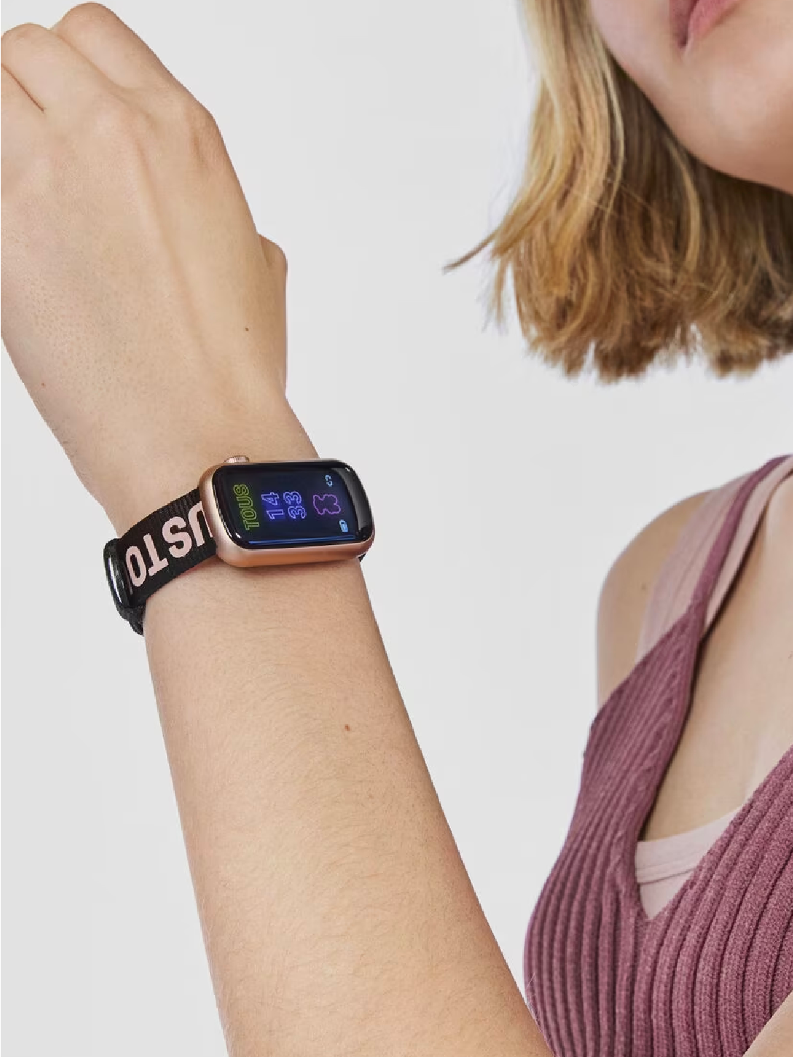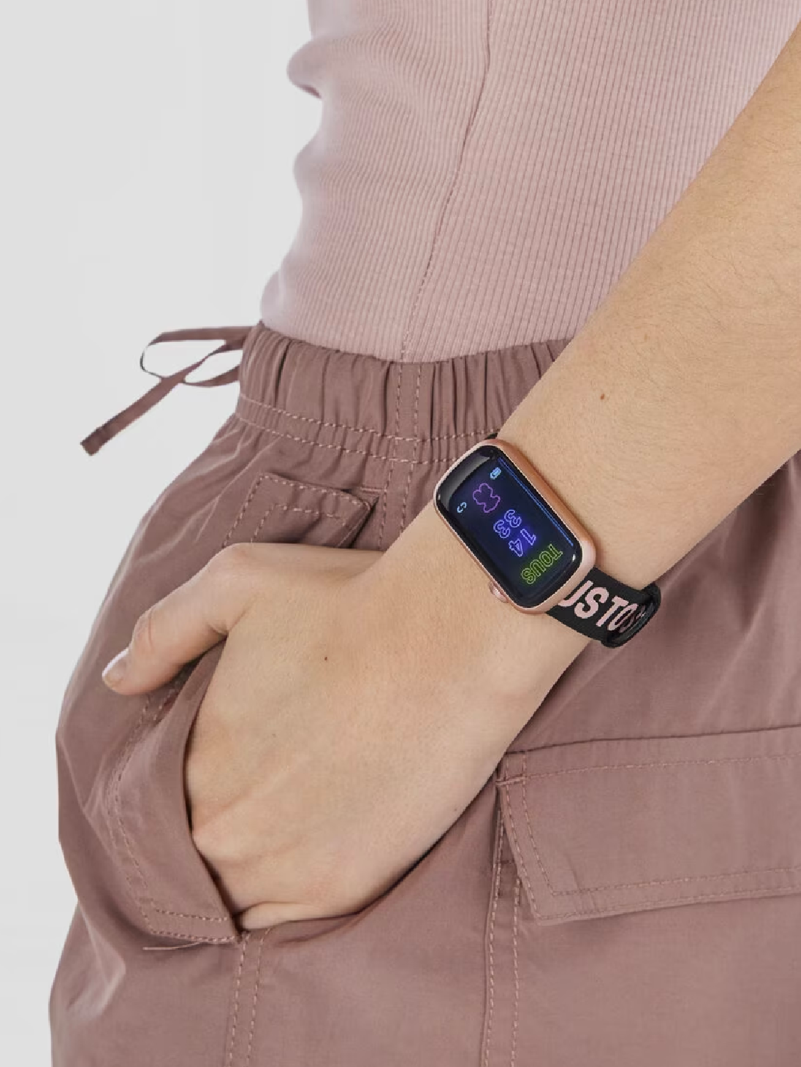 Lleva toda la tecnología en tu muñeca con nuestro smartwatch. Una caja de PC rosado y dos correas intercambiables de nylon y silicona en tonos rosa palo y negros de la colección TOUS T-Band. Los beneficios de un smartwatch y las últimas tendencias, en un mismo reloj.
