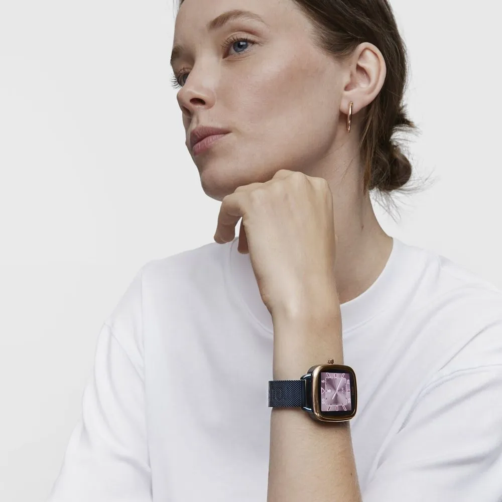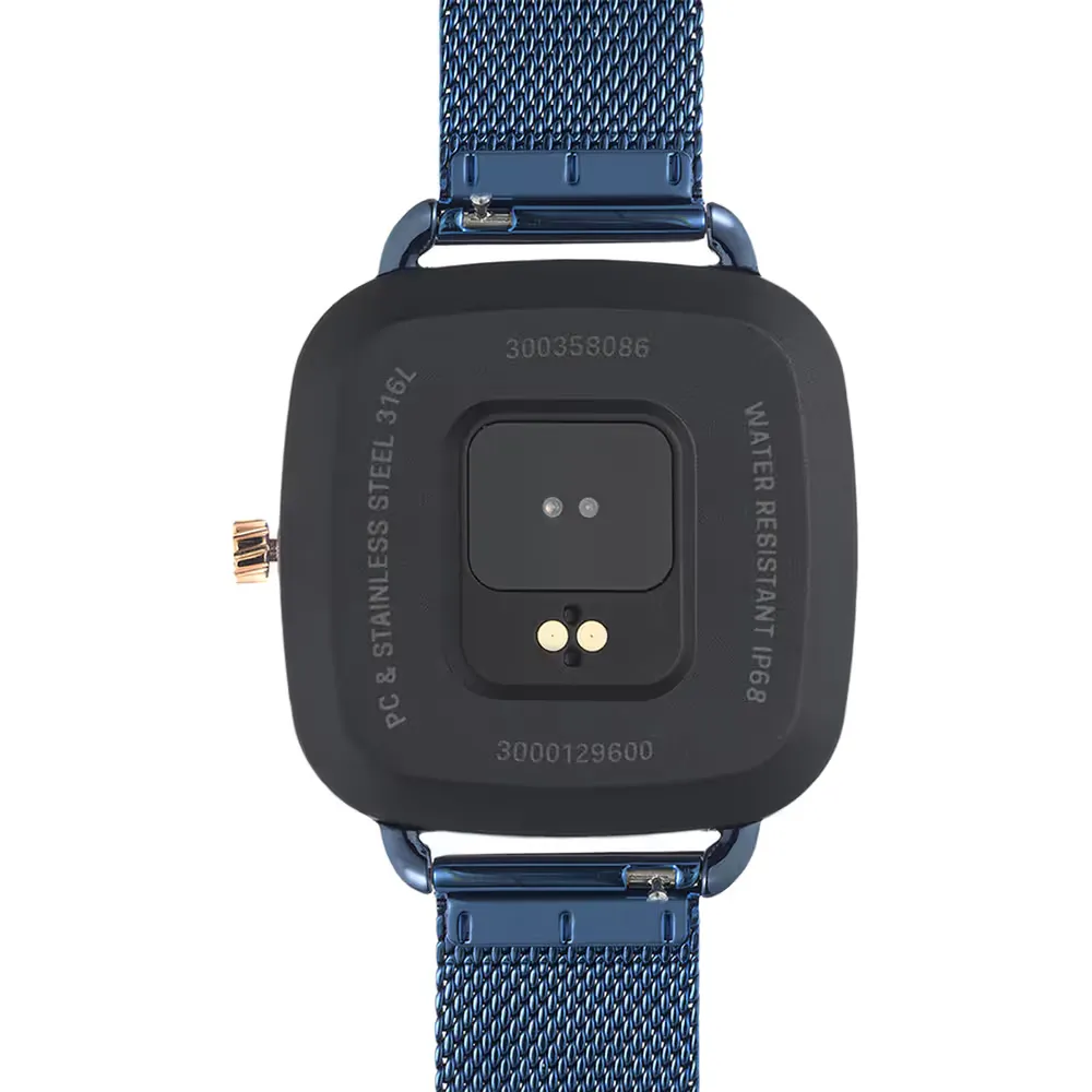 Smartwatch D‑Connect con caja de acero IPRG rosa y brazalete de acero azul; dimensiones 38,8 × 39,5 mm y pantalla TFT‑DLC táctil en color de 1,40 pulgadas. Compatible con Android 7.0/iOS 12.0 y Bluetooth 5.0, integra sensor de frecuencia cardíaca, contador de pasos, calorías y múltiples modos deportivos. Batería de 180 mAh recargable, autonomía de 5‑7 días y resistencia IP68.
