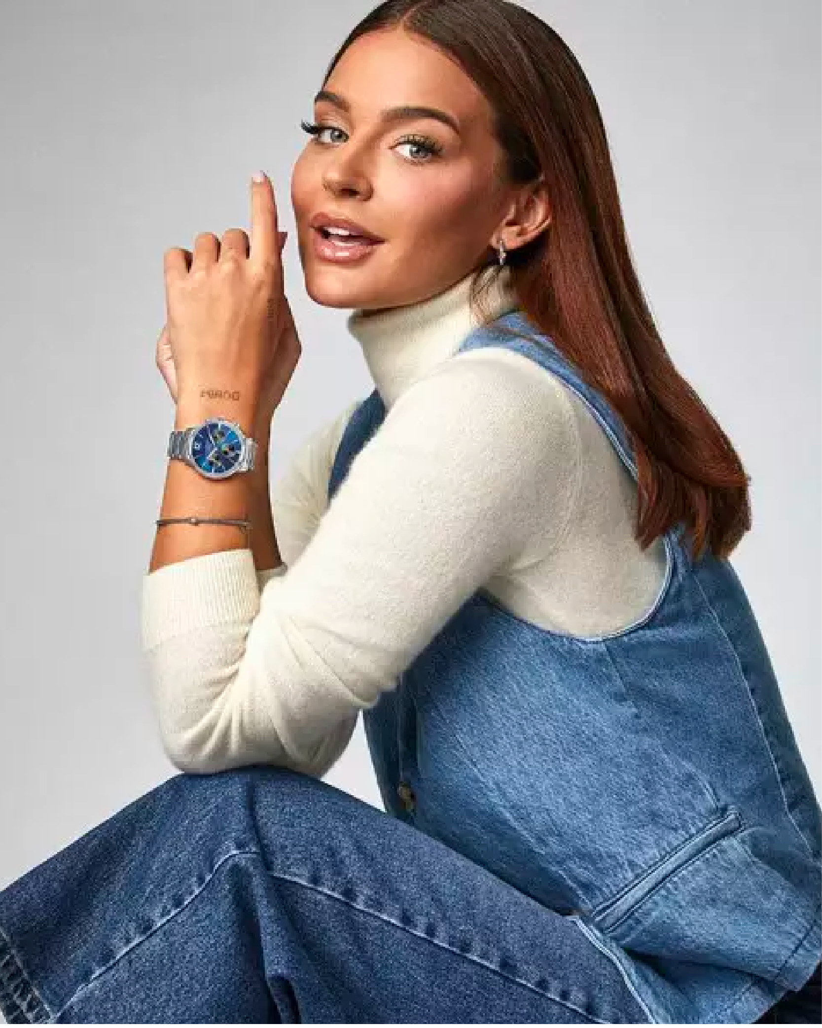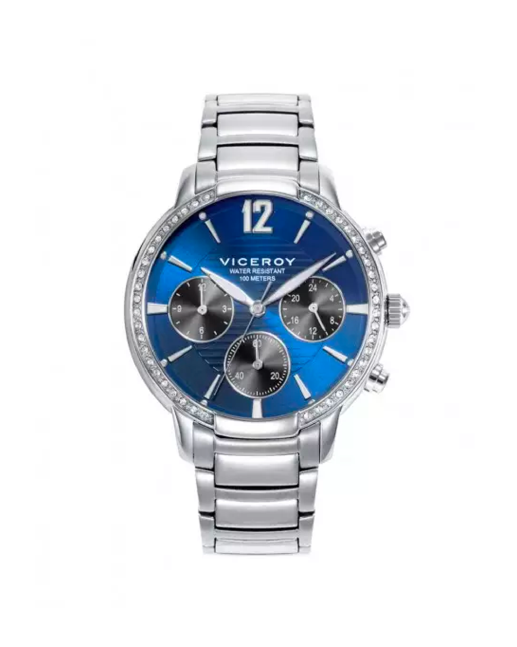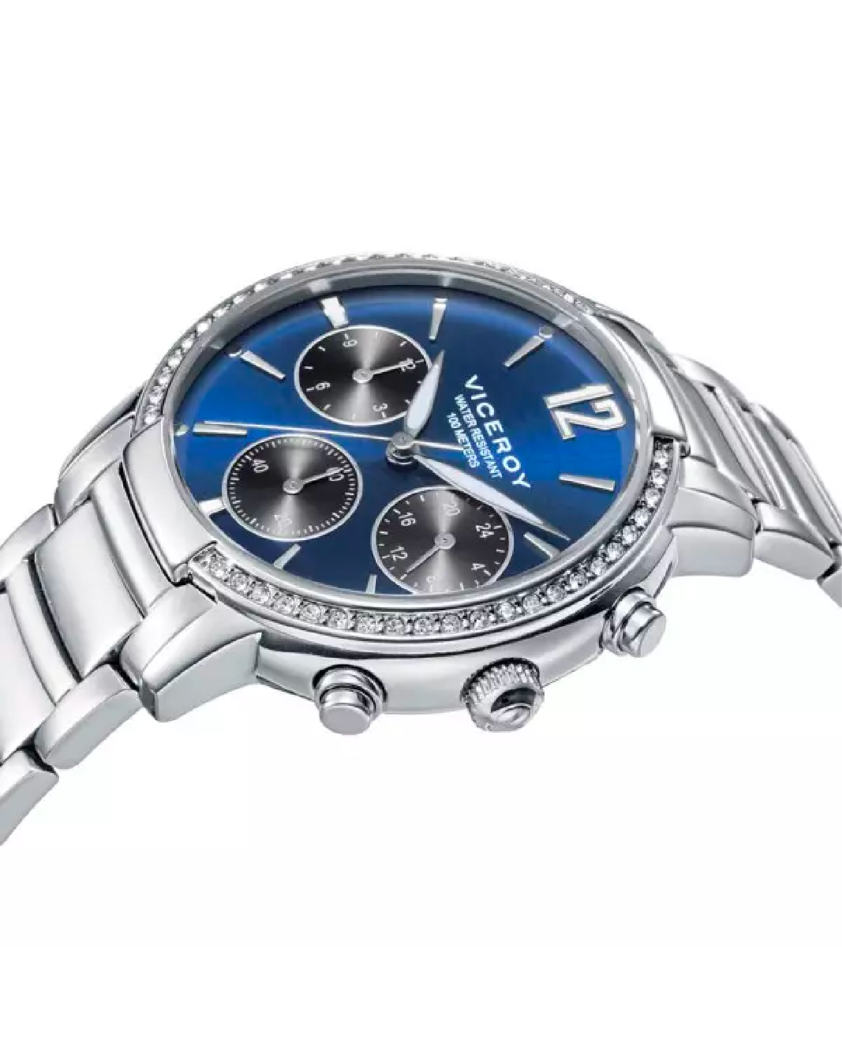 Reloj Viceroy 401208-35 para mujer, Colección Laura Escanes esfera azul con el cristal óptico mineral, tres agujas multifunciones, caja de acero inoxidable de 38 mm. de diámetro con circonitas, cadena de acero con cierre oculto desplegable.
